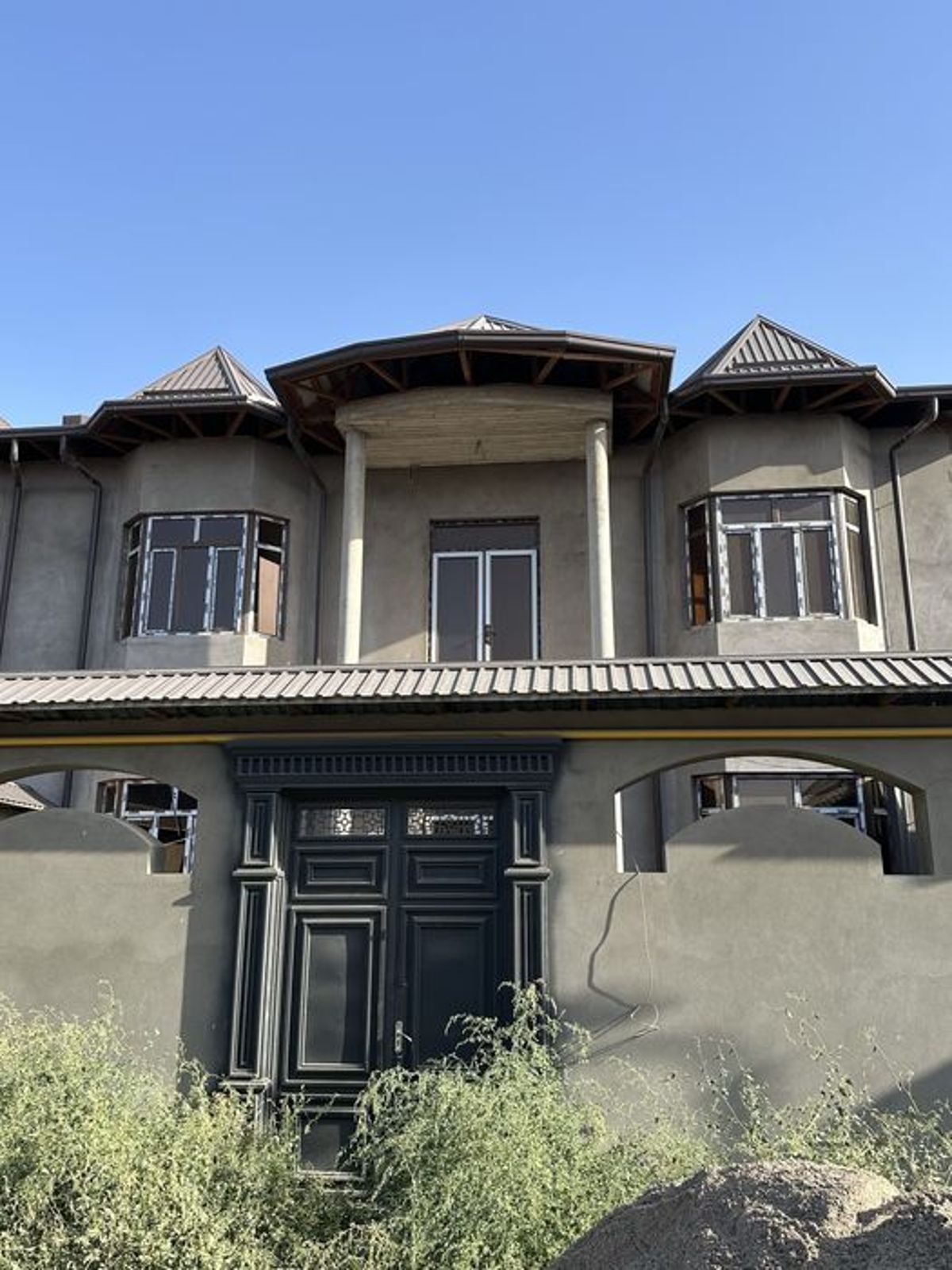 участок 5.5 сотых етажность 2 этажа комнат 8 все есть стиль:хайтек жилой площадь 135+ кв.м ремонт не доконца сделан окна потолки канализация, свет, газ, окна, сан узел сан узлов 5 2 общих 3 в спальне