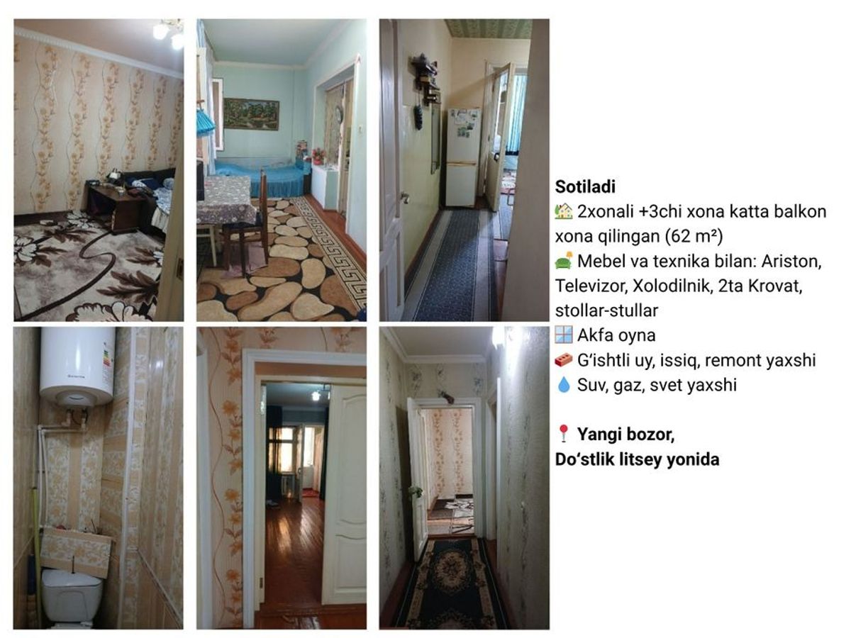 Kvartira sotiladi 2xonali +3chi xona katta balkondan qilingan (62m²) Mebel, texnika bilan: Ariston, Televizor, Xolodilnik, 2ta Krovatlar, stollar-stullar Akfa oyna Gʻishtli uy, issiq, remont yaxshi Suv, gaz, svet yaxshi Yangi bozor, Doʻstlik litsey yonida 45 ming → Telegramdan lichkaga yozing . Продается квартира 2-х комнатная + 3-я комната сделанная из большого балкона (общая площадь 62 м²) С мебелью и техникой: Ariston, телевизор, холодильник, 2 кровати, столы-стулья Окна Акфа Кирпичный дом, тепло, хороший ремонт Вода, газ, свет в порядке Ориентир: Янги Базар и лицей Дустлик Цена 45 тысяч → Пишите в личку в Телеграм