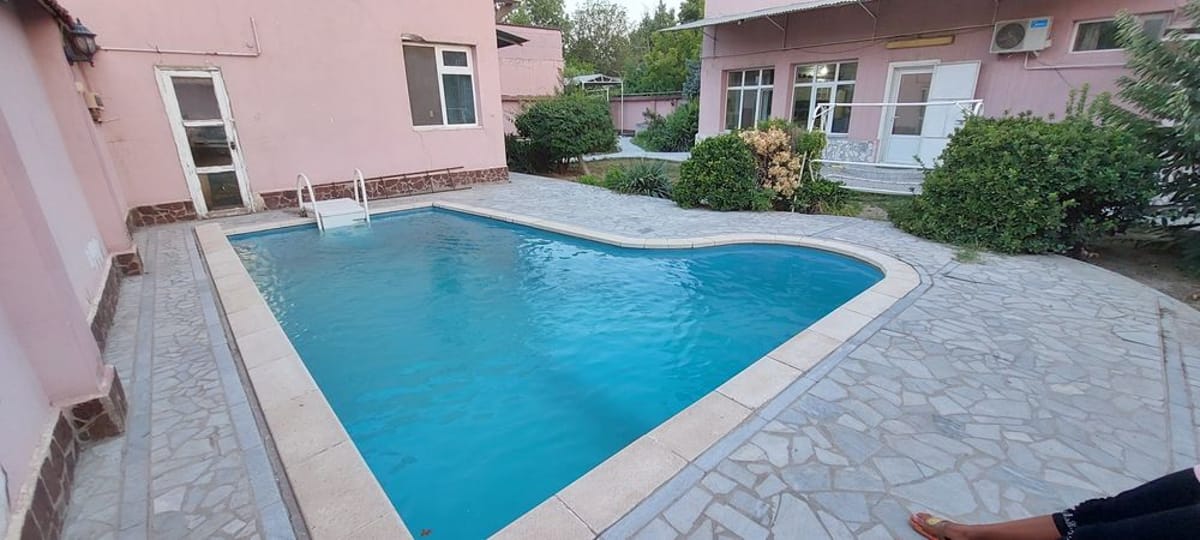 СРОЧНО!!! НЕ МАКЛЕР Продаю свой участок 6,5 соток 8 комнат, на участке расположены 2 дома. Имеется 2 бассейна летний и зимний а также сауна. Въезд для 4 машин. Можно под гостиницу и детсий сад место позволяет. Участок расположен в очень удобном месте рядом 83 школа, госпитальный рынок, аэропорт, северный вокзал. Цена 100.000$ за сотку