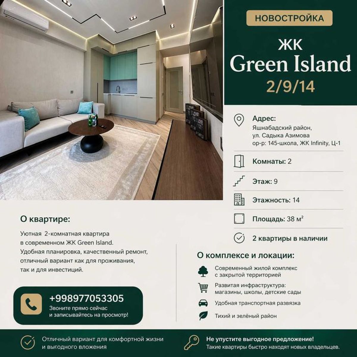 Продаётся компактная и современная 2-комнатная квартира в новом жилом комплексе Green Island в Яшнабадском районе. Отличная локация — ул. Садыка Азимова, ориентир: 145 школа, ЖК Infinity, Ц-1. Развитая инфраструктура, удобная транспортная доступность. Этаж: 9 из 14 Площадь: 38 м² Удобная и функциональная планировка Идеально под аренду и инвестицию В наличии 2 квартиры Цена: 135 000 $ +998977053305 Отличный вариант по ликвидной цене, звоните!