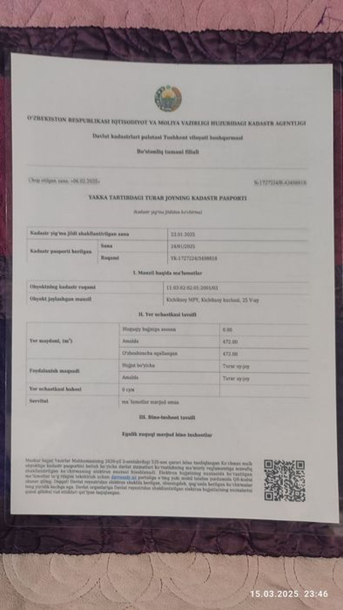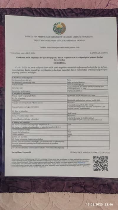 Оқтош Сойлиқда уй жой сотилади (хужжатлари тозза). 4.72 сотих уй жой + 2.5 сотих (6* 35 метр) захват бор. 2,5 сотихдан 1 сотихини хужжат қилиб қўшиб олса бўлади. Пул керак бўлиб сотилвоти (қарз бор). СОТИЛАДИ вариантга йўқ. кадастр бор. Хушманзара, хавоси тоза жой. Яшаса бўладиган тайёр жой. 3 та хонаси ичида ошхона ва санузели бор. Сув, свет, газ, канализация, интернет бор. Мактаб боғча яқин. Поликлиника ёнимизда. Оқтош центридан ўнга қайрилганда масжиддан 500 метрла чамаси кирилади. 3 та томон тоғлар кўриниб туради. Ёнимизда уйлар йўқ дала жойлашган шу сабаб яхши проектлар тушади ва Угам чотқол, оқтош тоғлари, чимён амирсой тоғлари дача баландда жойлашгани учун жуда чиройли кўриниб туради. Денгиз сатхидан 900 метр баландликда жойлашган. Йерни узунлиги 35метр, эни 13.5 метр. 30 * 13.5 метр қилиб Г холатда иморат қурса бўлади. Арчалар ва мевали дарахтлар, узумлар жуда кўп. Хавоси жуда хам тоза ва фойдали. Хужжат қилишимизга анча вақтимиз, пулимиз ва мехнатимиз кетган. Илтимос оладиган инсонлар телефон қилинглар (10⁰⁰ дан 22⁰⁰). Оқтошдаги хар хил дачалар билан солиштириб бир биримизни асабимизни бузмайлик. Хамма сотадиган товарини нархини қийматини билади. Пул зарил бўлмаганда сотилмасди. Тушунганила учун рахмат. Тел: +998974257888 Телеграмга мурожаат қилсангиз хам бўлади.