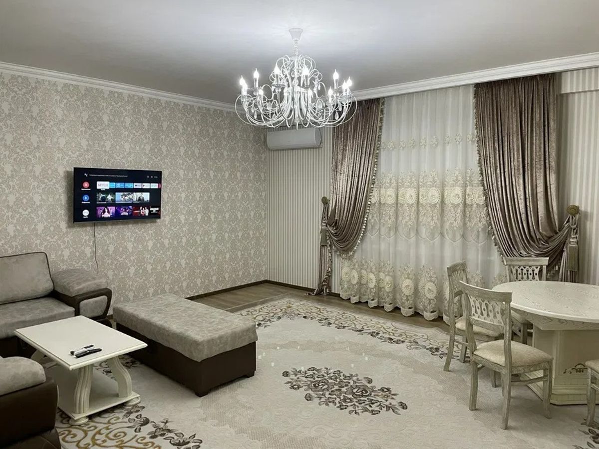 НОВОСТРОЙКА от "ГОЛДЕН ХАУС" Евроремонт. 3 комнатная +балкон. 2 сан узла, Новая стиральная машина. Новый утюг, сушка, гладильная доска. Пылесос. Квартира полностью мебелировна. Кухня с новой мебелью и посудой в комлекте. 4-х камерный новый холодильник, микроволновка и духовка. Во всех комнатах кондиционер новый. Все комнаты большие, зал 6×6. Большой смарт ТВ+ диван/ спальный. Холл 5×4 с новым диваном и кресло Внизу детская площадка. Двор охраняемый... ПОТОРГУЕМСЯ. Предоплата за 2 месяца. Если вас заинтересовало предложение, пишите/звоните в телег. Есть варианты. Комиссионные 50%. ФОТО у нас реальные. Будем рады помочь Вам.