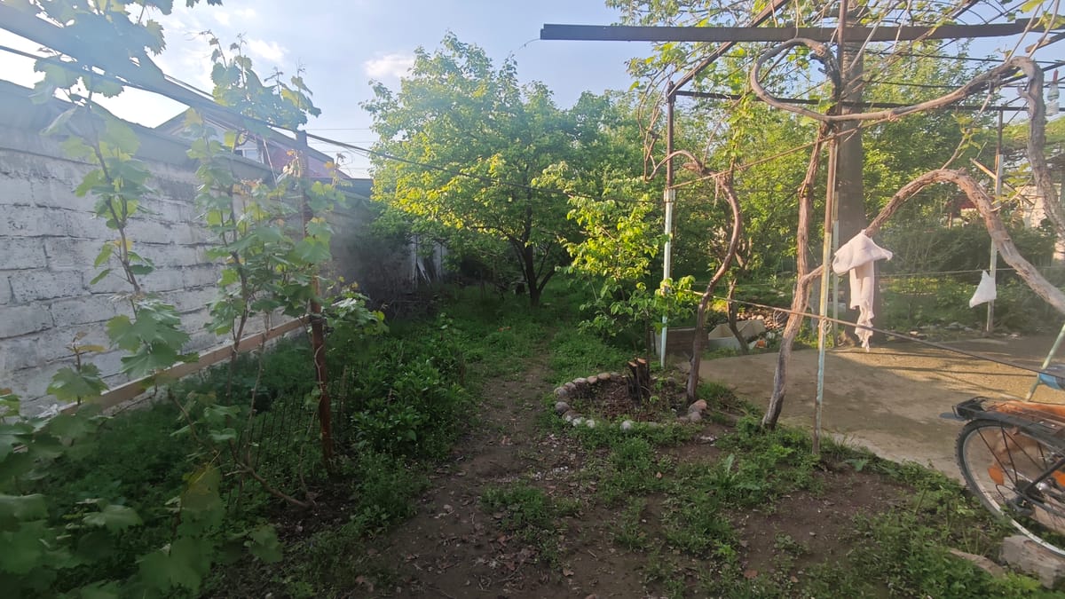 Широкая тихая улица, сам участок ровной прямоугольной формы строения не прилегают к соседям, канализация городская, электричество и вода есть ,плюс есть скважина для полива.много плодовых деревьев. Подробнее по телефону+