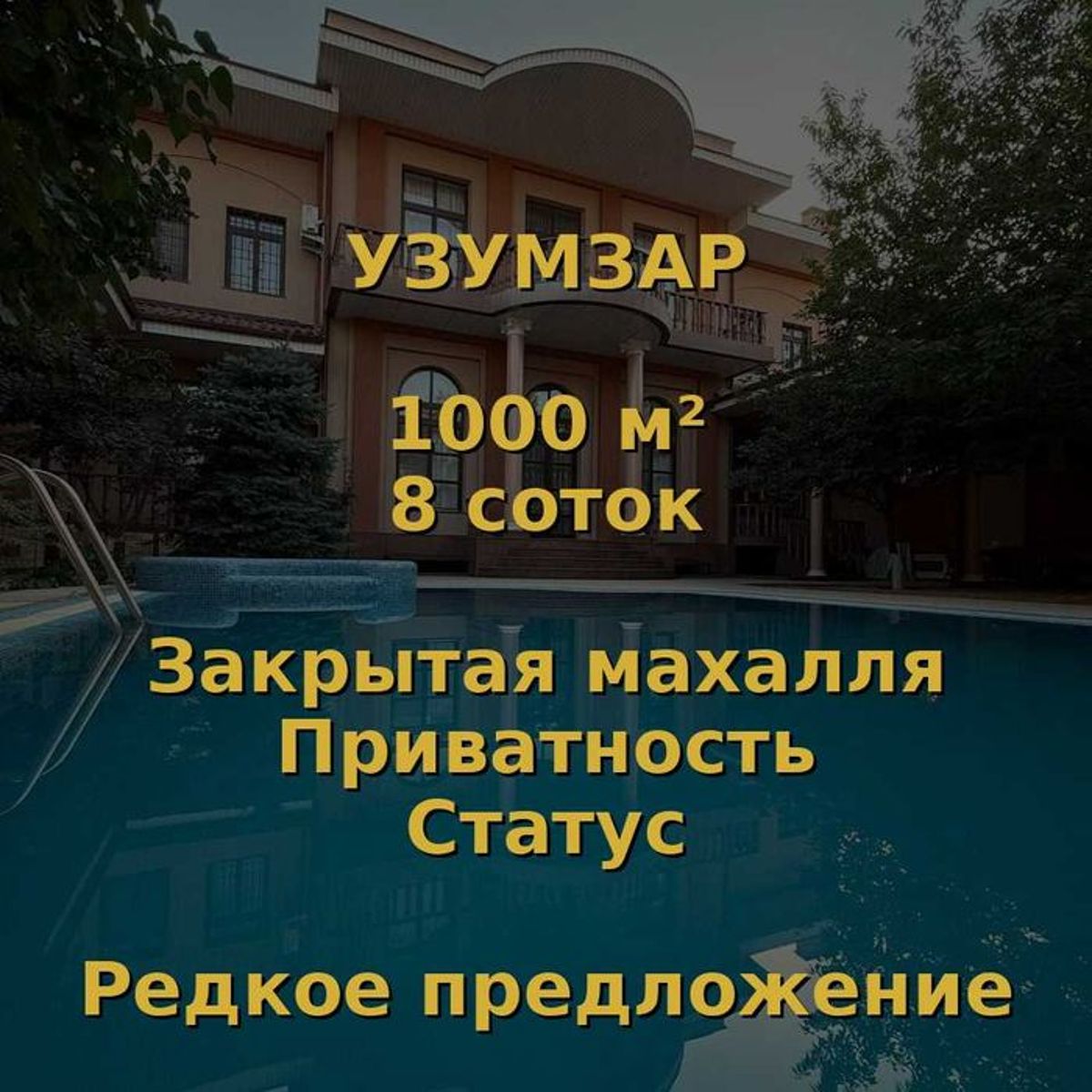 ПРЕМИАЛЬНЫЙ ДОМ В УЗУМЗАРЕ Один из самых закрытых и редких объектов Мирзо-Улугбекского района. Такие дома практически не выходят в открытую продажу. ЛОКАЦИЯ: Закрытая охраняемая махалля Узумзар Тихое и престижное окружение Удобный заезд с двух сторон ХАРАКТЕРИСТИКИ: • 3 уровня • Общая площадь: 1000 м² • Участок: 8 соток • Бассейн • Сауна • Барбекю зона • Полностью укомплектован мебелью и техникой ПРЕИМУЩЕСТВА: - Приватность и безопасность - Редкая локация (дефицит на рынке) - Выход на две улицы — высокая ликвидность - Перспектива реконструкции под современный проект ВАЖНО: Такие объекты покупают не ради ремонта — их покупают ради статуса, земли и локации. Цена: 1 000 000 у.е. (торг обсуждается) узумзар дом дом мирзо улугбек элитный дом ташкент премиум дом ташкент дом с бассейном ташкент дорогой дом ташкент
