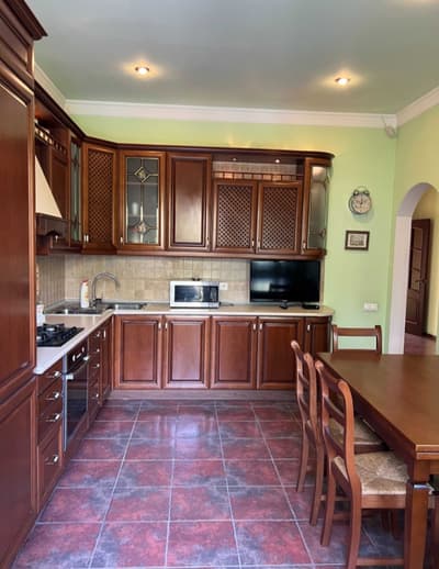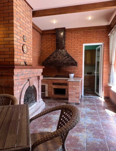 Дом с "Камином" по эксклюзивному проекту, спроектирован в строгом классическом Европейском стиле. В отделке дома применялись натуральные материалы. Интерьер дома дополняет кухня "Луизиана" вишня пр-во Италия, спальня из коллекции "CAMEL" в светлых матовых тонах и другая мебель из коллекции "CAMEL" пр-во Италия. Так же зона отдыха с уличной кухней и камином, рядом с бассейном, создают уютную домашнюю атмосферу во дворе.