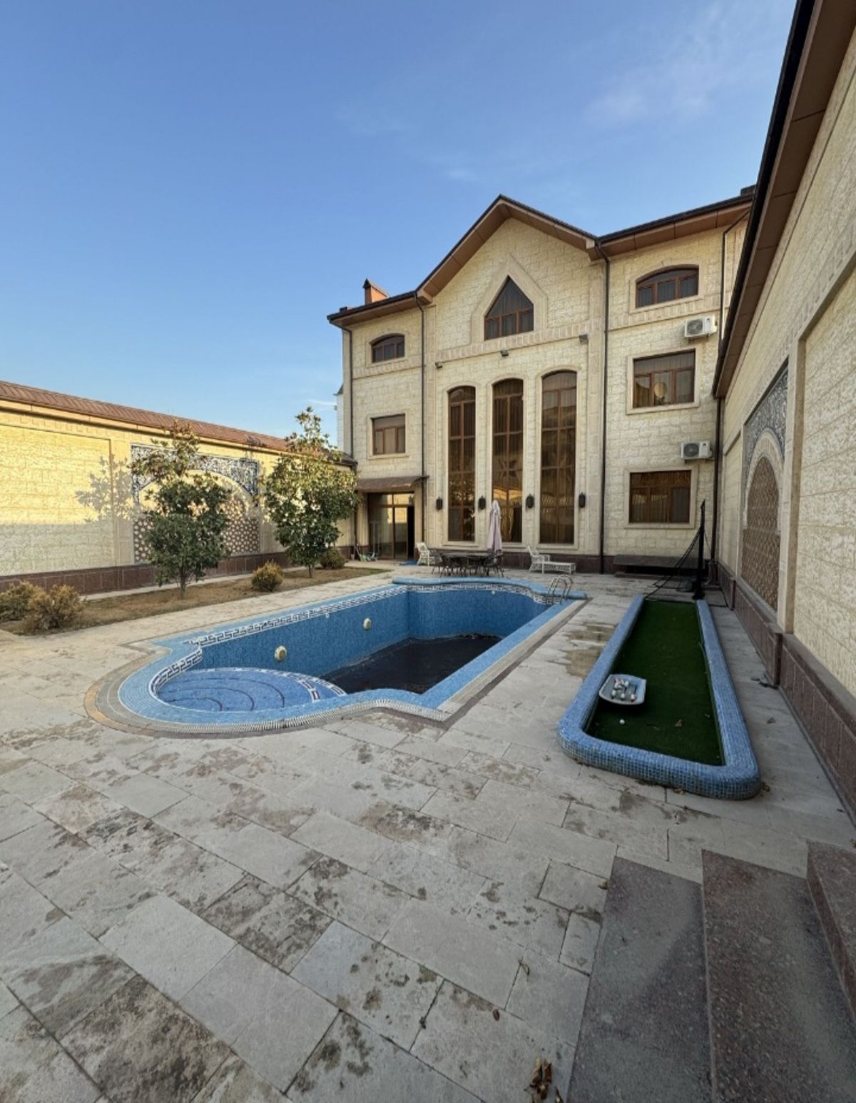 Сдается участок 4 уровня . 11 комнат , 3 холла , 5 сан.узлов , 6 спальных комнат , тренажерный зал , финская сауна , бассейн , гольф дорожка .