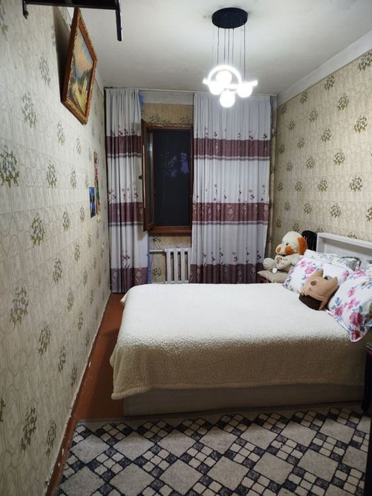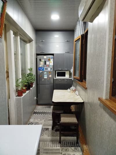 Находится в Зангиатинском р-н. Пос.Мясокомбинат. Кухня на балконе. 2-х комнатная квартира переделанная в З-х.на З этаже панельного дома. Рядом находится школа,дет сад. Пятнадцать минут езды до ипподрома.