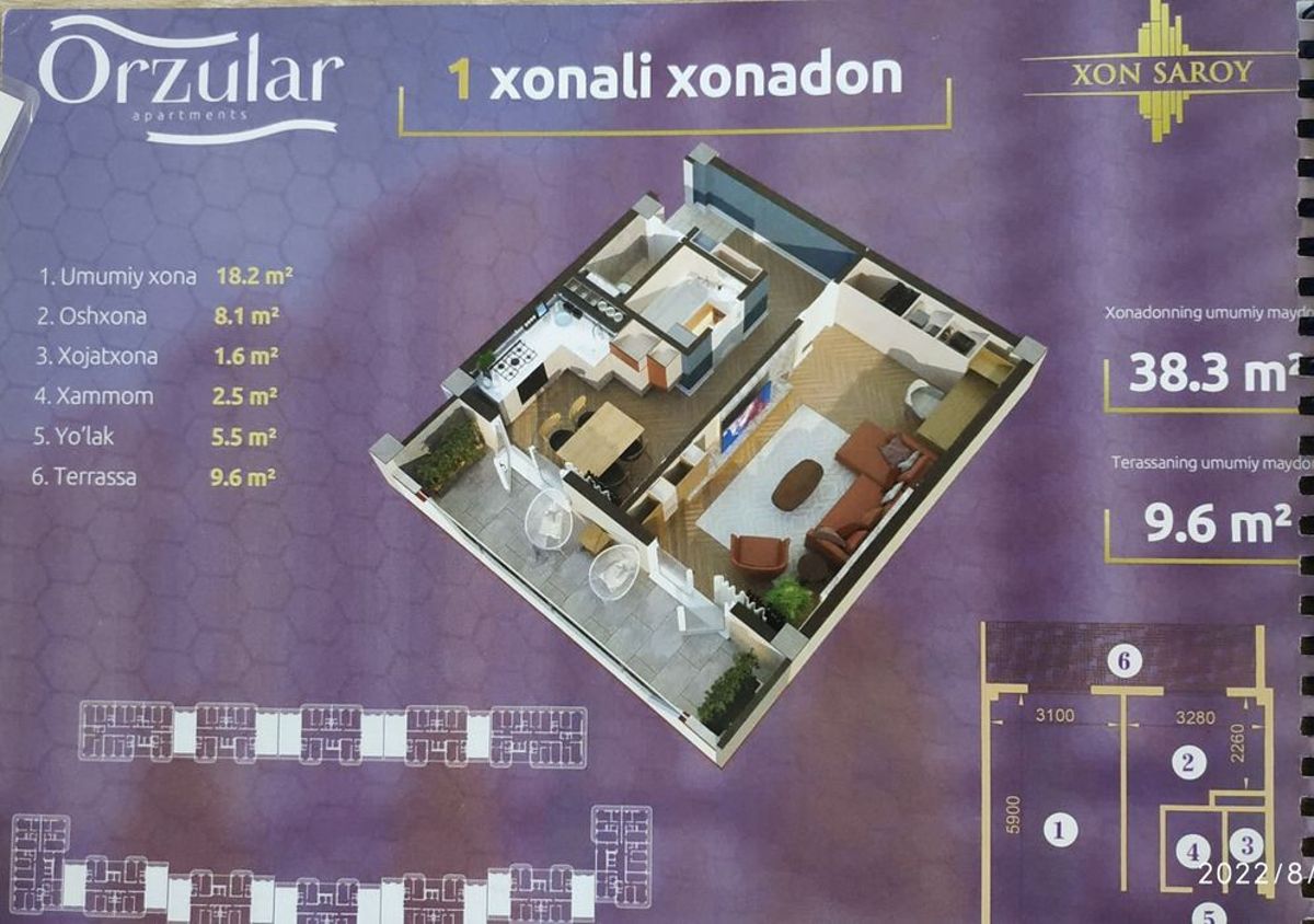 Продам однокомнатную квартиру в ЖК Орзулар Хонсарой Orzular Xonsaroy Рядом метро Туркистан