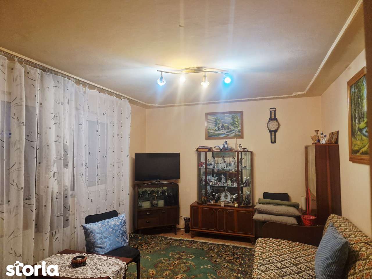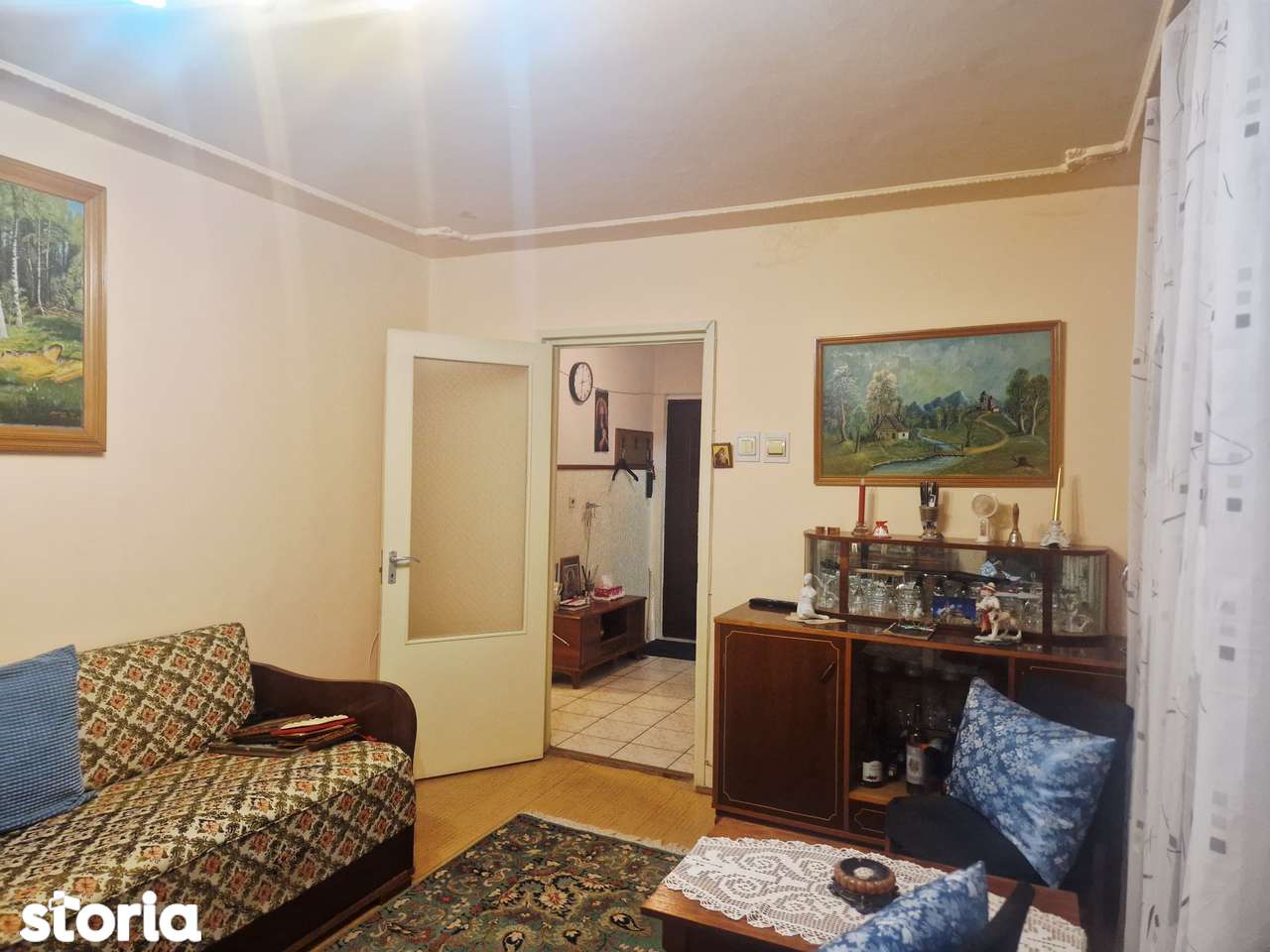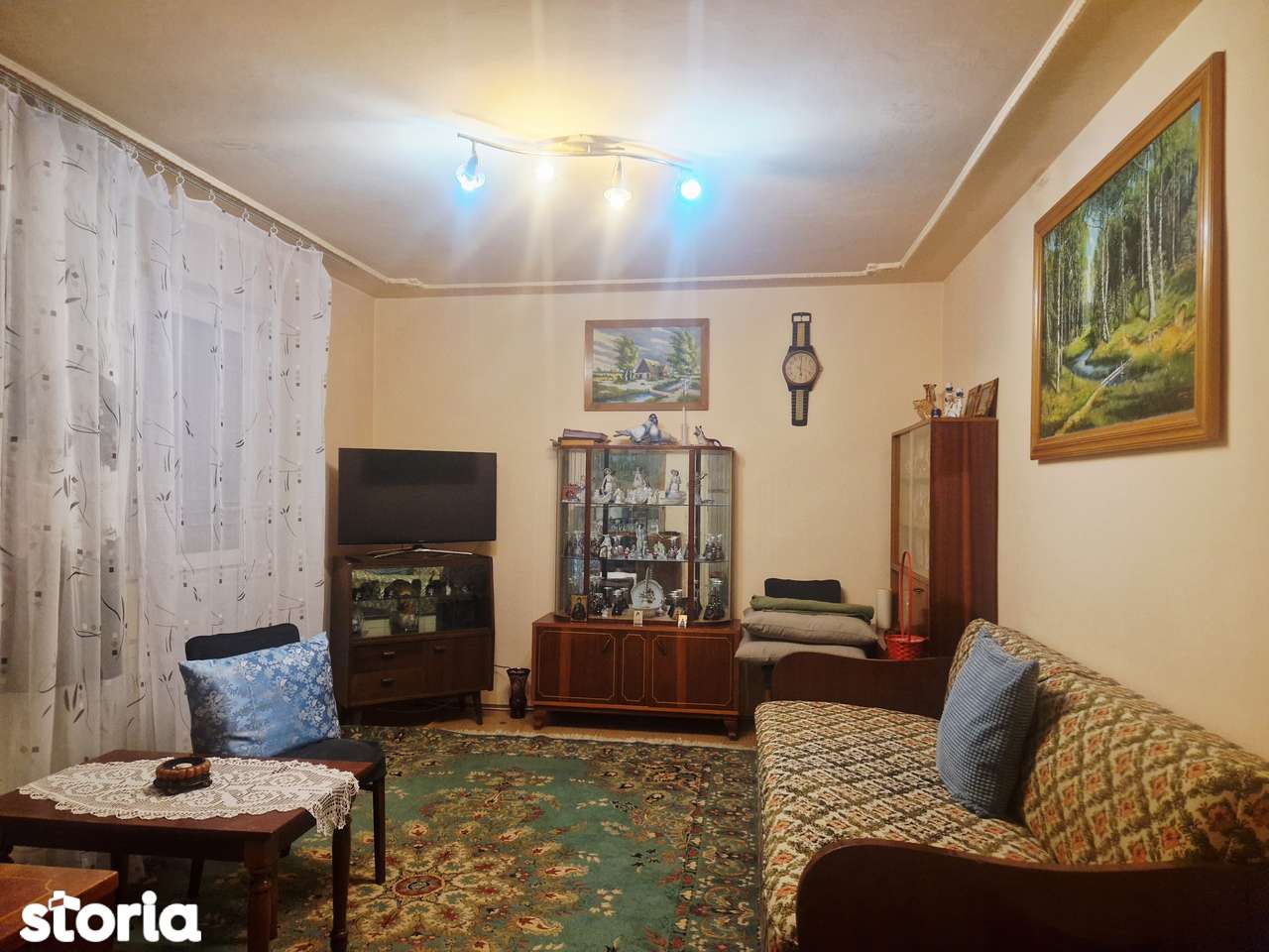 - Явно устаревший интерьер: советская мебель, старый ковёр, обои и отделка 80-90х годов