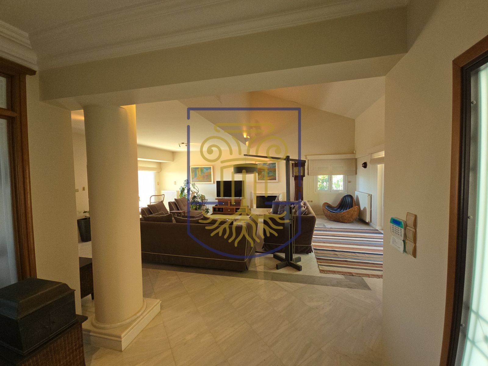 - Крупный водяной знак закрывает значительную часть интерьерного фото
