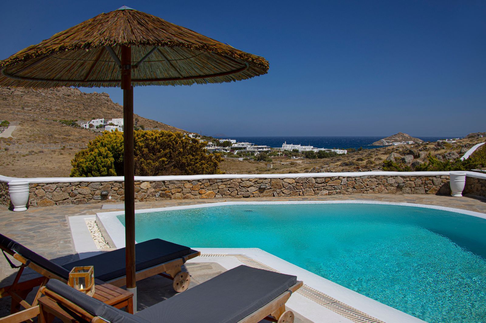 Красивая вилла расположена в спокойном районе Калафатиса, менее чем в 2 км от пляжа. Как часть комплекса автономных вилл, она сочетает традиционную архитектуру Миконоса с роскошью современных удобств. Вилла может принять до 10 гостей при специальных договоренностях. На первом уровне находятся гостиная, полностью оборудованная открытая кухня и спальня с ванной комнатой. На верхнем уровне расположена главная спальня с ванной и собственной верандой с видом на море. На подземном уровне три двухместные спальни, две ванные комнаты (одна с ванной при спальне), малая кухня и прачечная. Все помещения полностью кондиционированы. Вилла имеет 5 спален и 4 ванные комнаты, 2 из которых с ванной при спальне. Хорошо спланированная наружная зона перед виллой включает большой современный бассейн и просторную зону отдыха вокруг него. Также есть встроенный гриль под элегантной деревянной pergola, где гости могут готовить собственные блюда, наслаждаясь замечательным видом на море. Вилла идеальна для семей или пар и друзей, желающих насладиться всем, что предлагает Миконос, и при этом иметь возможность уединиться в приватной обстановке. Лицензия греческого правительства (MHTE): 1173Κ91001363301 Стоимость: с ноября 2025 по апрель 2026 — 1900 евро в месяц плюс коммунальные услуги. Летний сезон: 43 000 евро для Villa Lucia и 53 000 для Villa Harmony. Предоставляемые услуги: встреча в аэропорту, помощь с арендой машины, передача ключей и инструктаж, полный приветственный пакет, встреча с персоналом уборки, услуги консьержа и шефа по запросу.