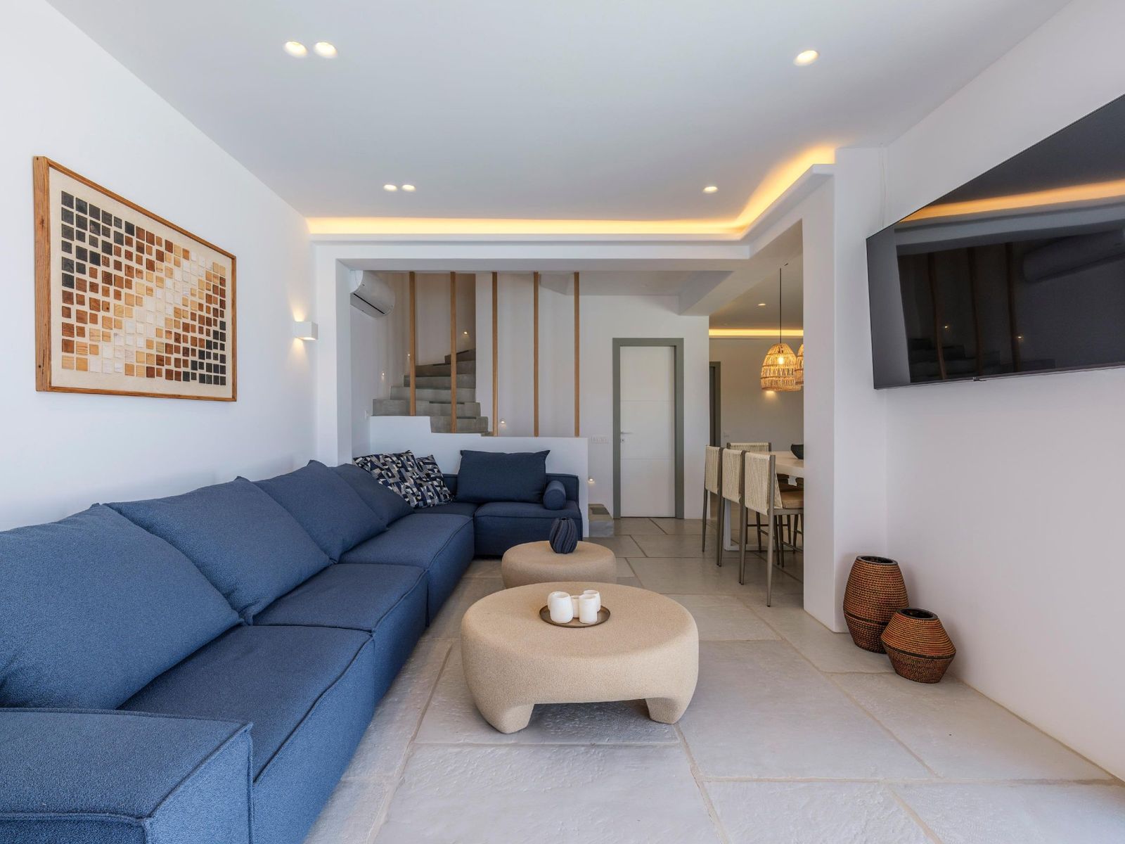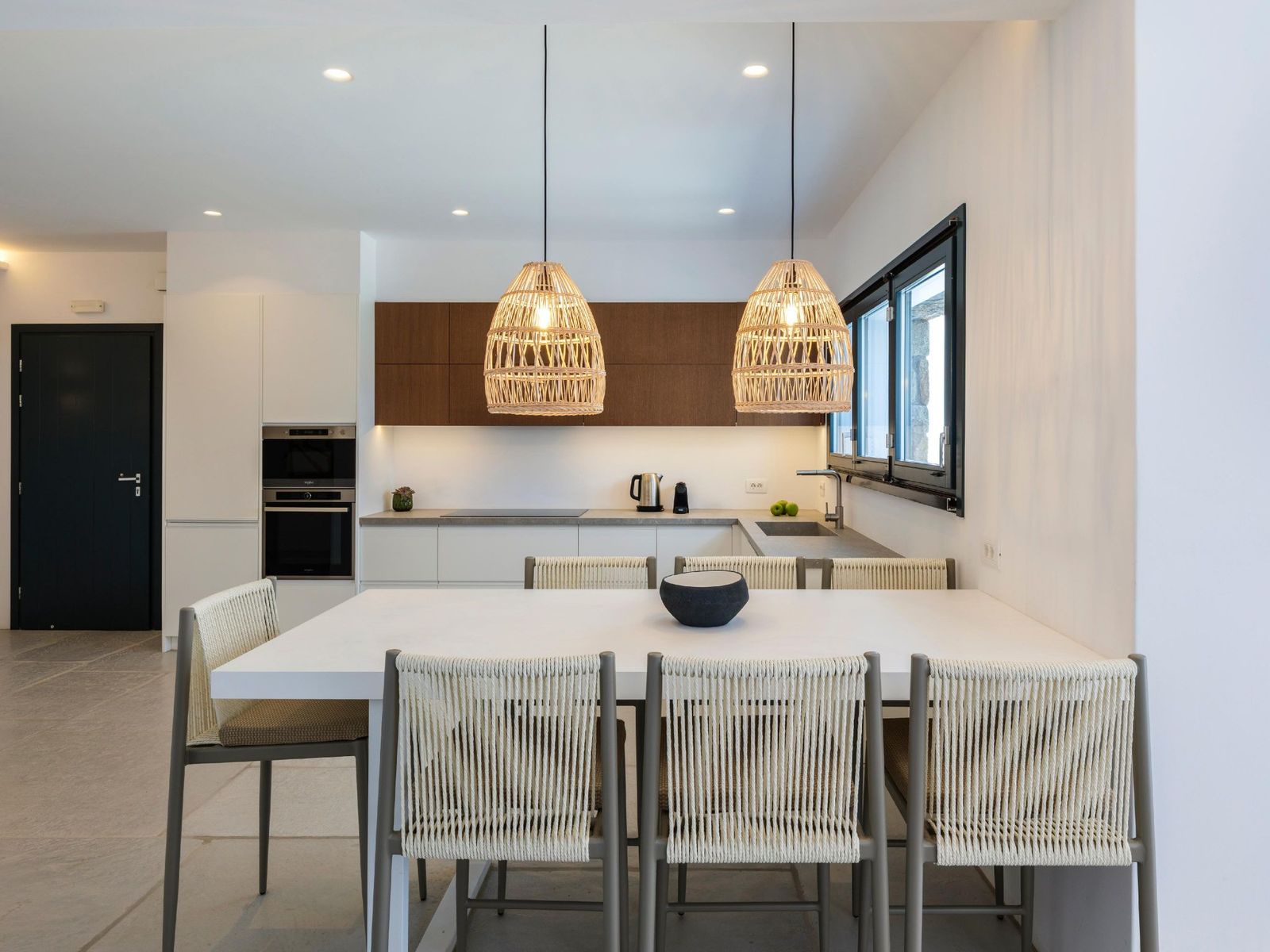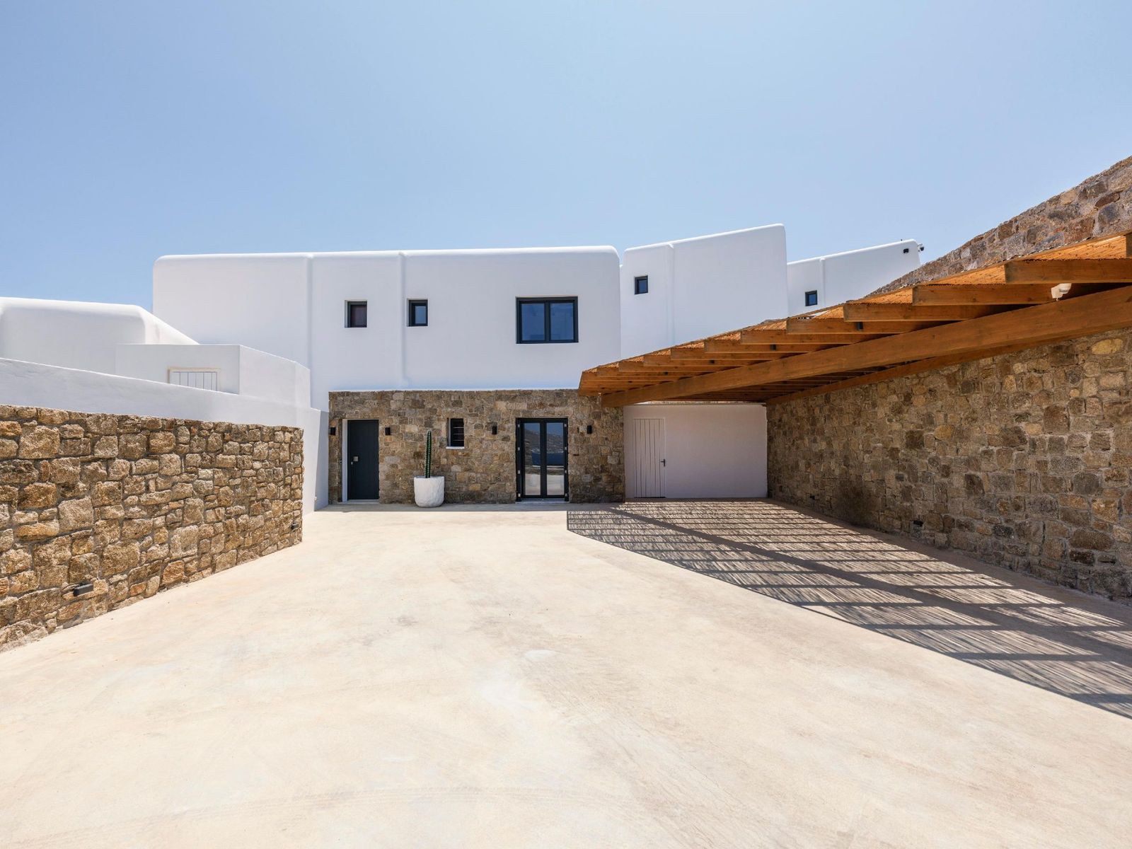 Вилла площадью 215 кв.м располагается на двух уровнях. На первом этаже находятся открытая кухня, столовая, гостиная, главная спальня с двуспальной кроватью и собственной ванной, кладовая и гостевой санузел. На втором этаже расположены четыре спальни с двуспальными кроватями и собственными ванными комнатами, а также уютный коридор, ведущий на балконы с панорамными видами на Эгейское море и остров Миконос. Участок виллы площадью 1.000 кв.м профессионально благоустроен с террасными садами. Рядом с бассейном установлен павильон с видом на Киклады. На открытой территории расположены широкие террасы, бар у бассейна, зоны отдыха под перголой и место для барбекю. Бассейн с эффектом горизонта создаёт впечатление плавания в изумрудных водах Эгейского моря. Вилла находится в 100 метрах от берега в естественной бухте, обеспечивающей максимальную приватность. Знаменитый пляж Орнос расположен в 2 км, центр Миконоса находится в 3 км. Район Орнос (название означает «безветренный») на южной стороне острова славится развитой инфраструктурой, является популярной якорной стоянкой для яхт и судов. Новая вилла идеальна для приёма гостей и семейных встреч. Сертификат энергоэффективности в процессе оформления.