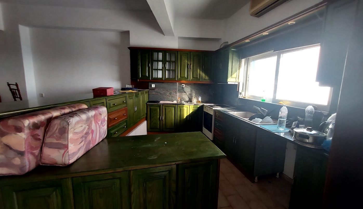 - Старая мебель, устаревшая кухня с зелеными фасадами, видны следы износа
