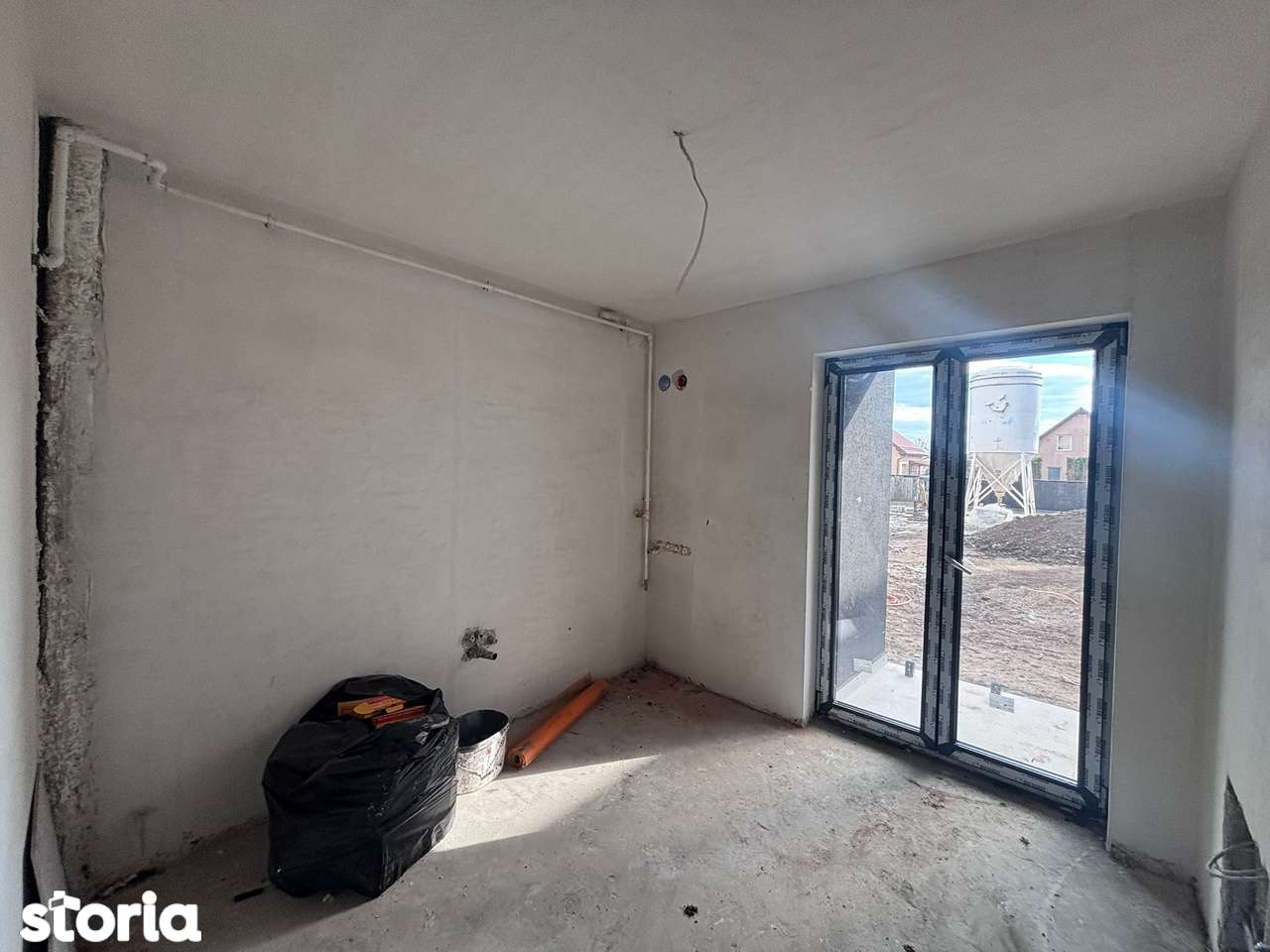 - Отсутствует чистовая отделка, окна установлены, но нет дверей, видны строительные материалы