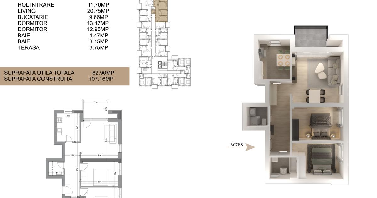Предлагаем к продаже трёхкомнатную квартиру площадью 82,90 м² в новом комплексе, расположенном на улице Drumul Cooperativei. Проект включает коммерческие помещения на первом этаже здания.