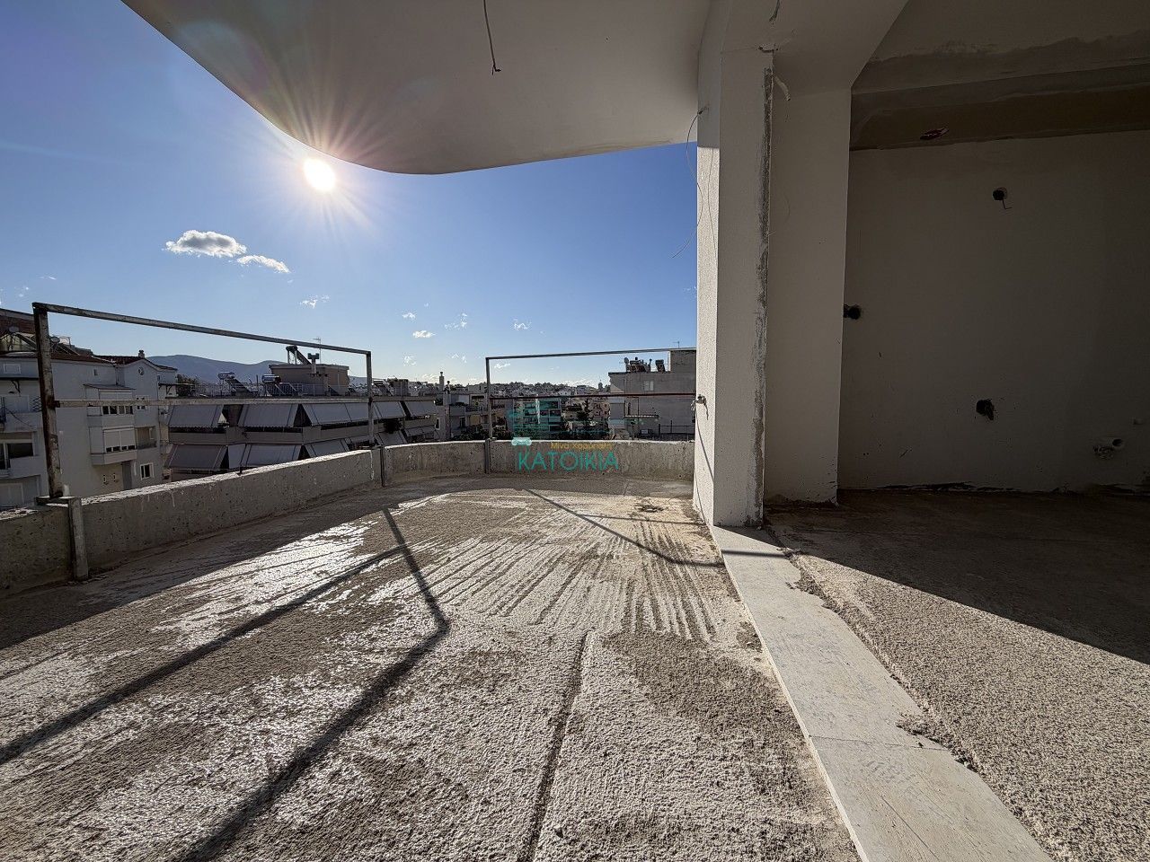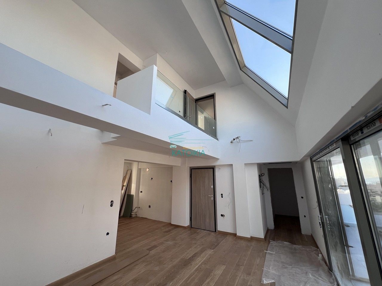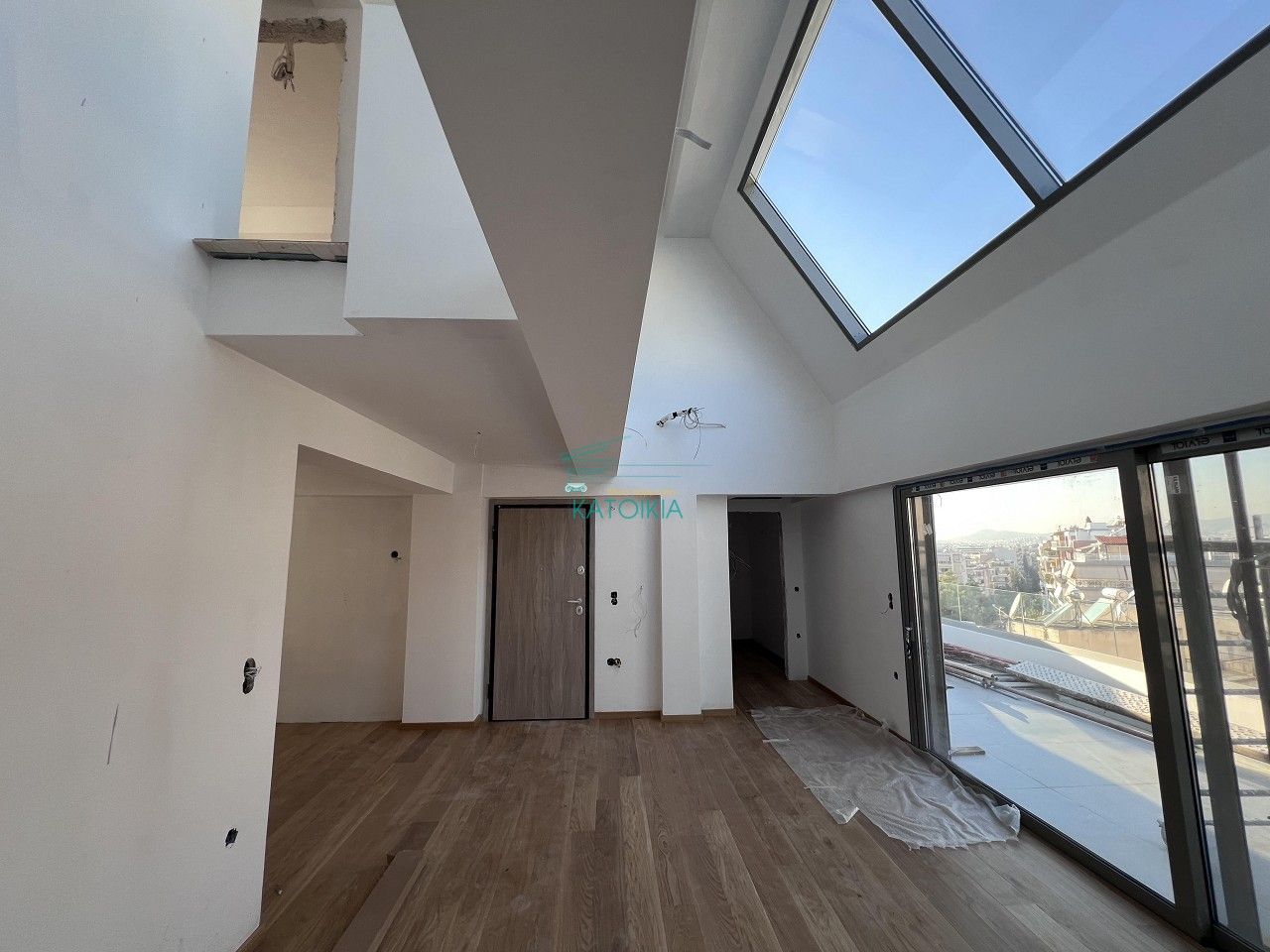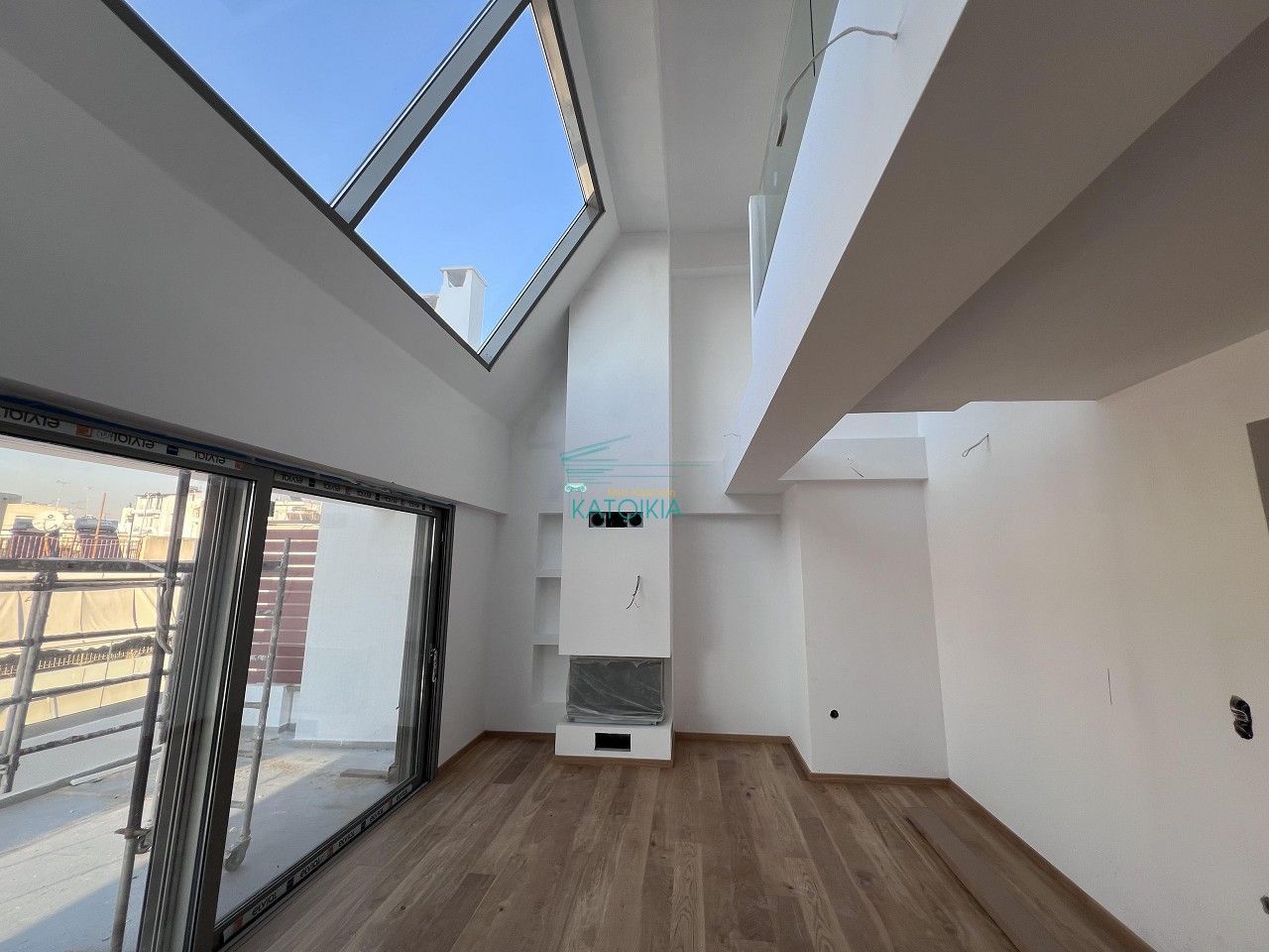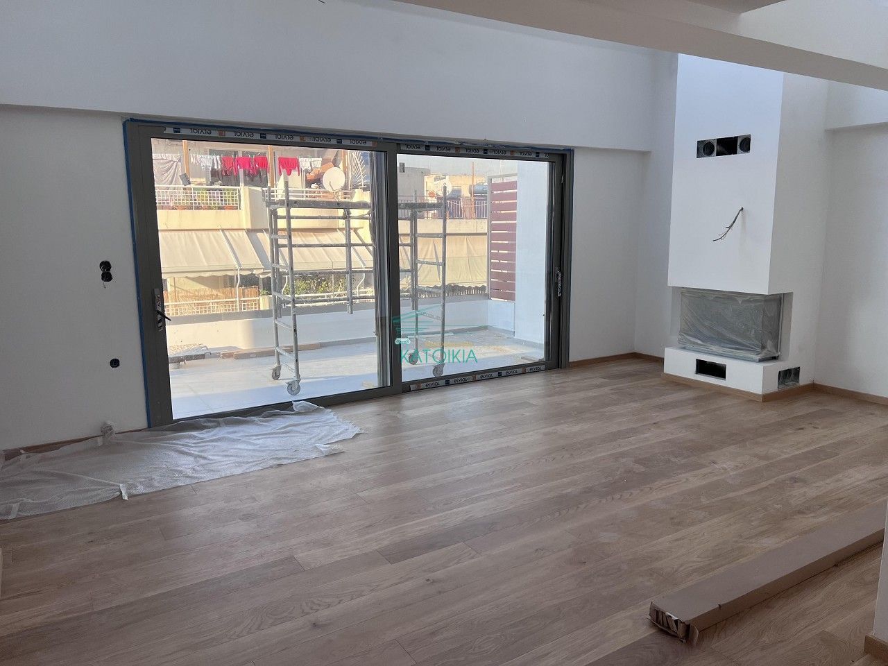 - Видны строительные материалы на балконе, защитная пленка на камине — ремонт не завершен