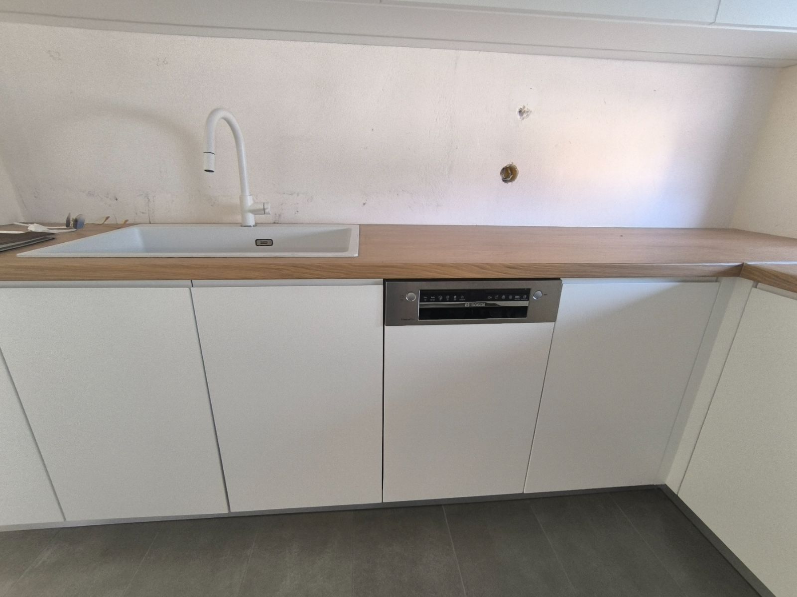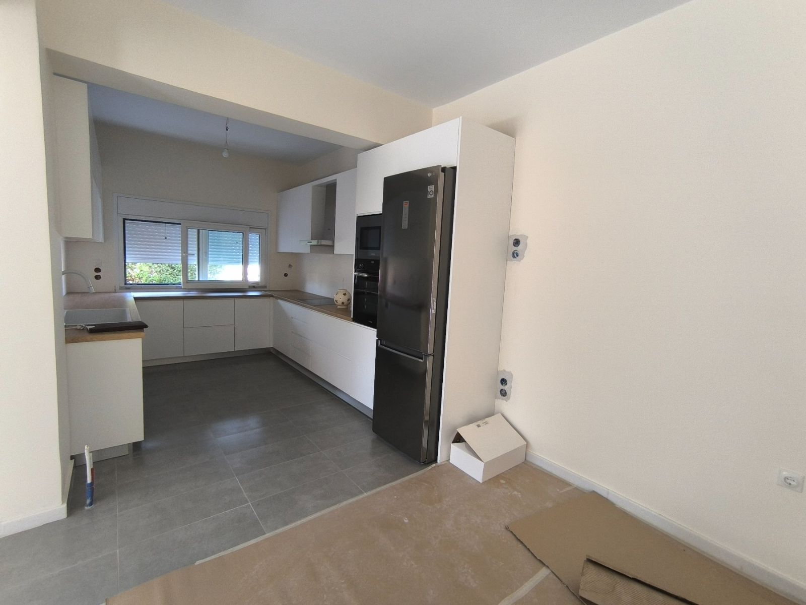 - На полу кухни видны картонные коробки, ремонт возможно не завершён полностью