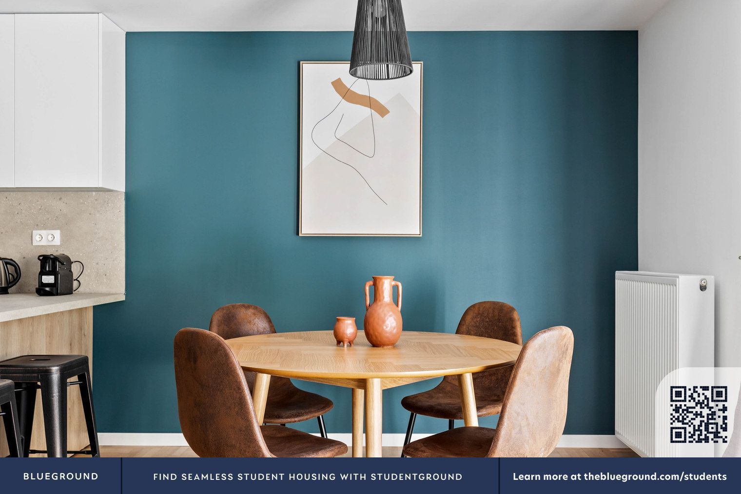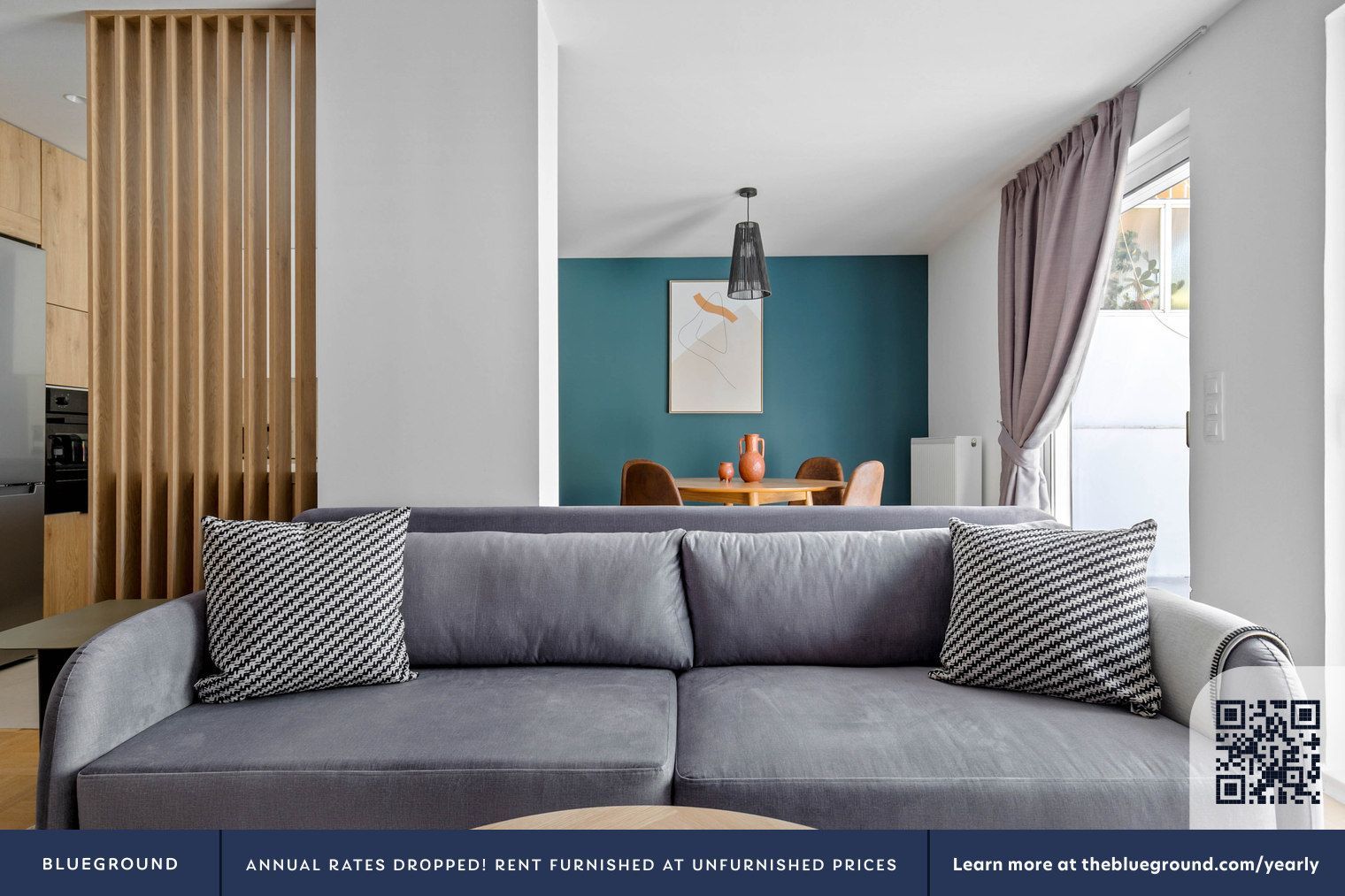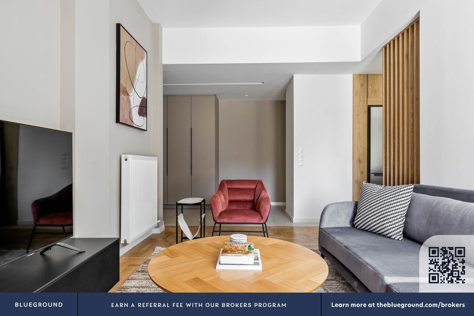 - Профессиональная постановочная съемка с мебелью, возможно арендное жилье (Blueground watermark)