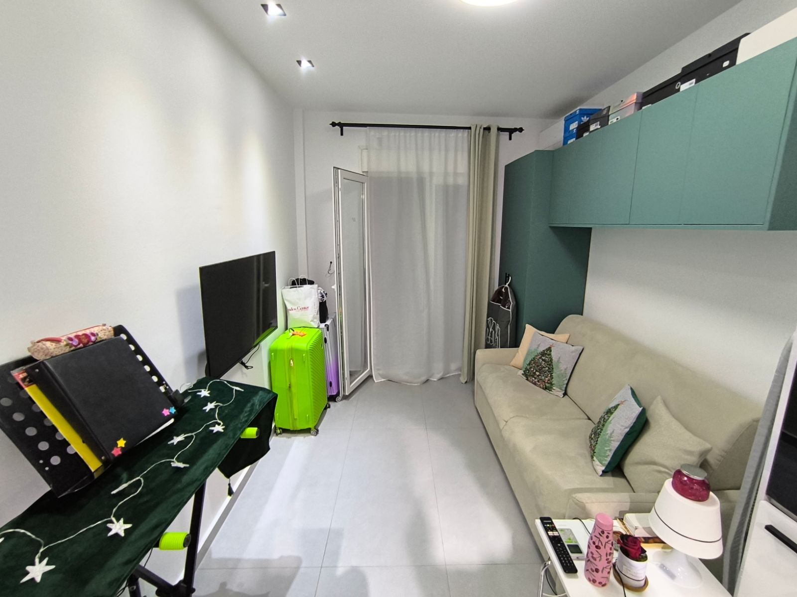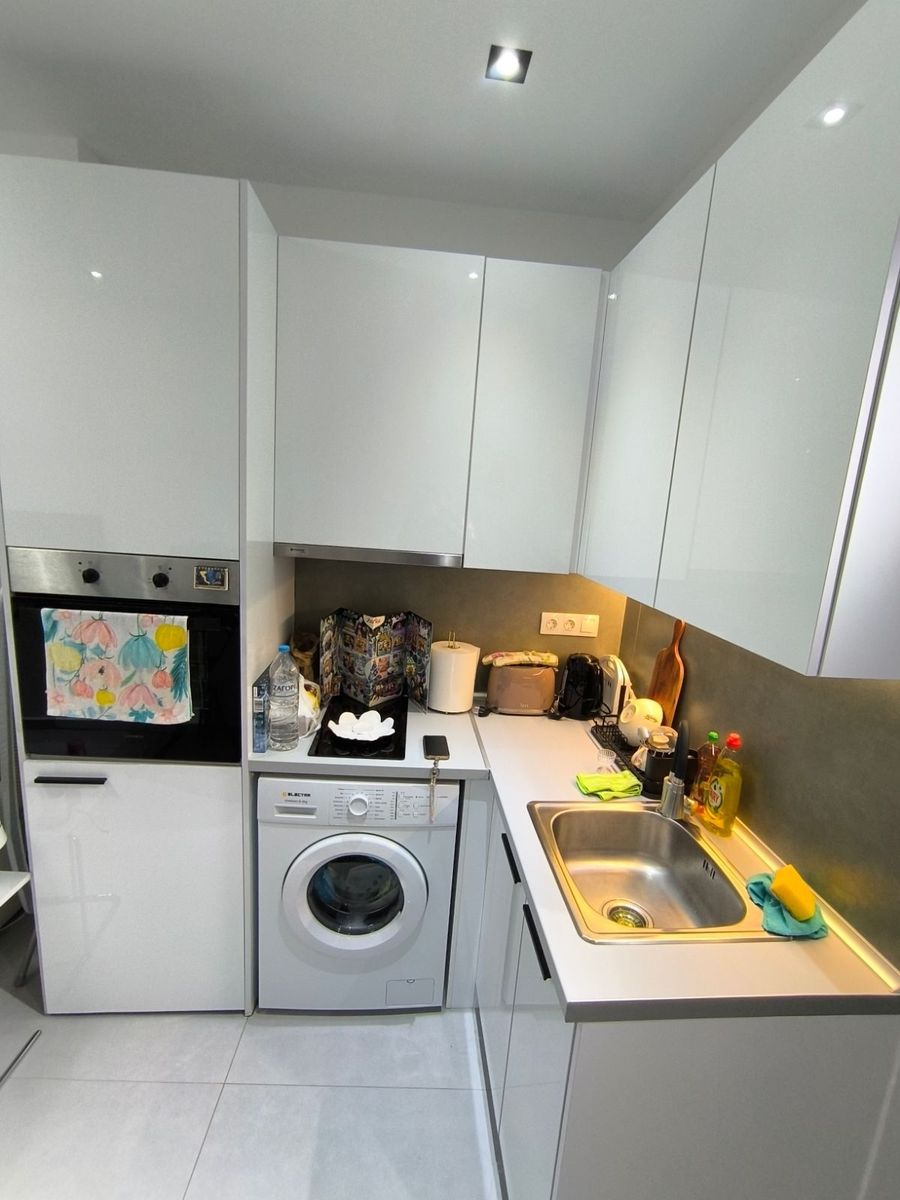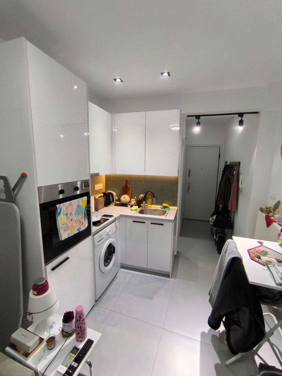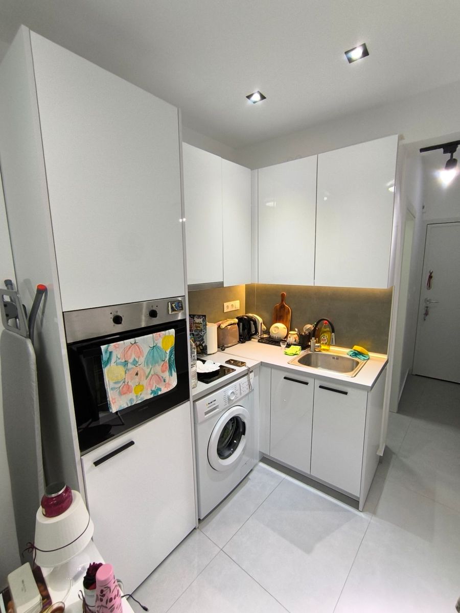 - Очень компактная студия, кухня совмещена с жилой зоной в узком пространстве