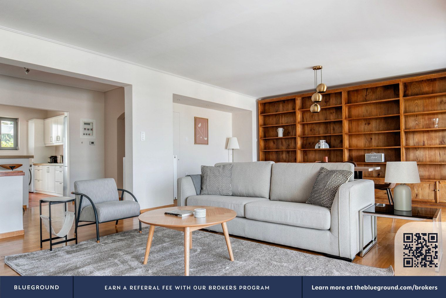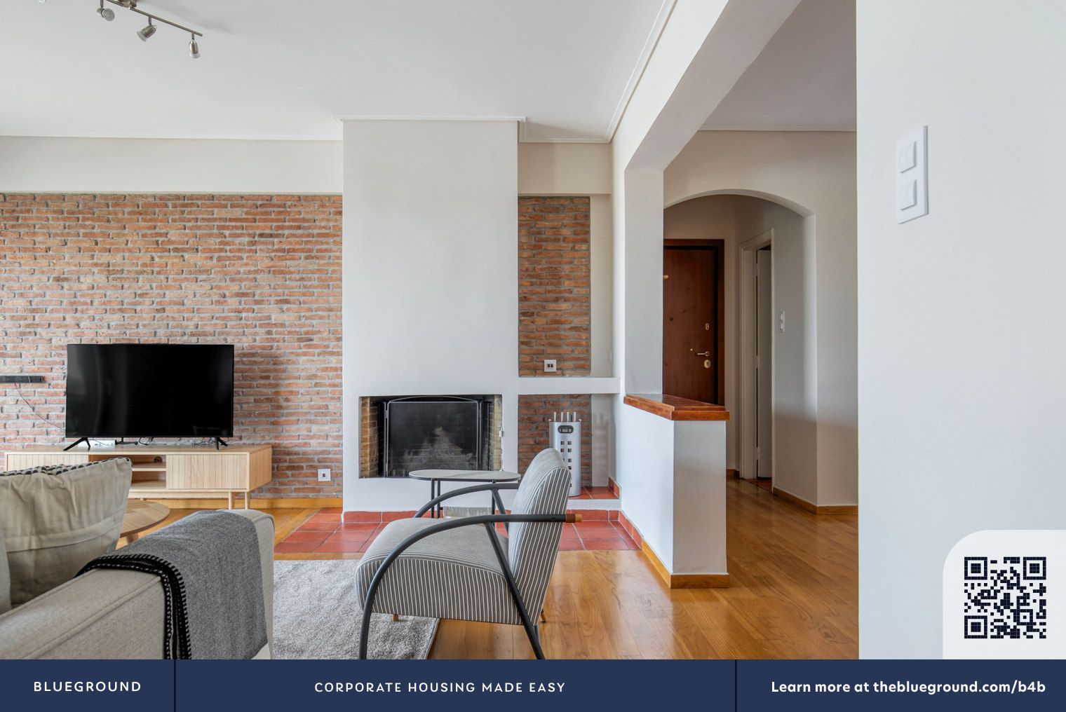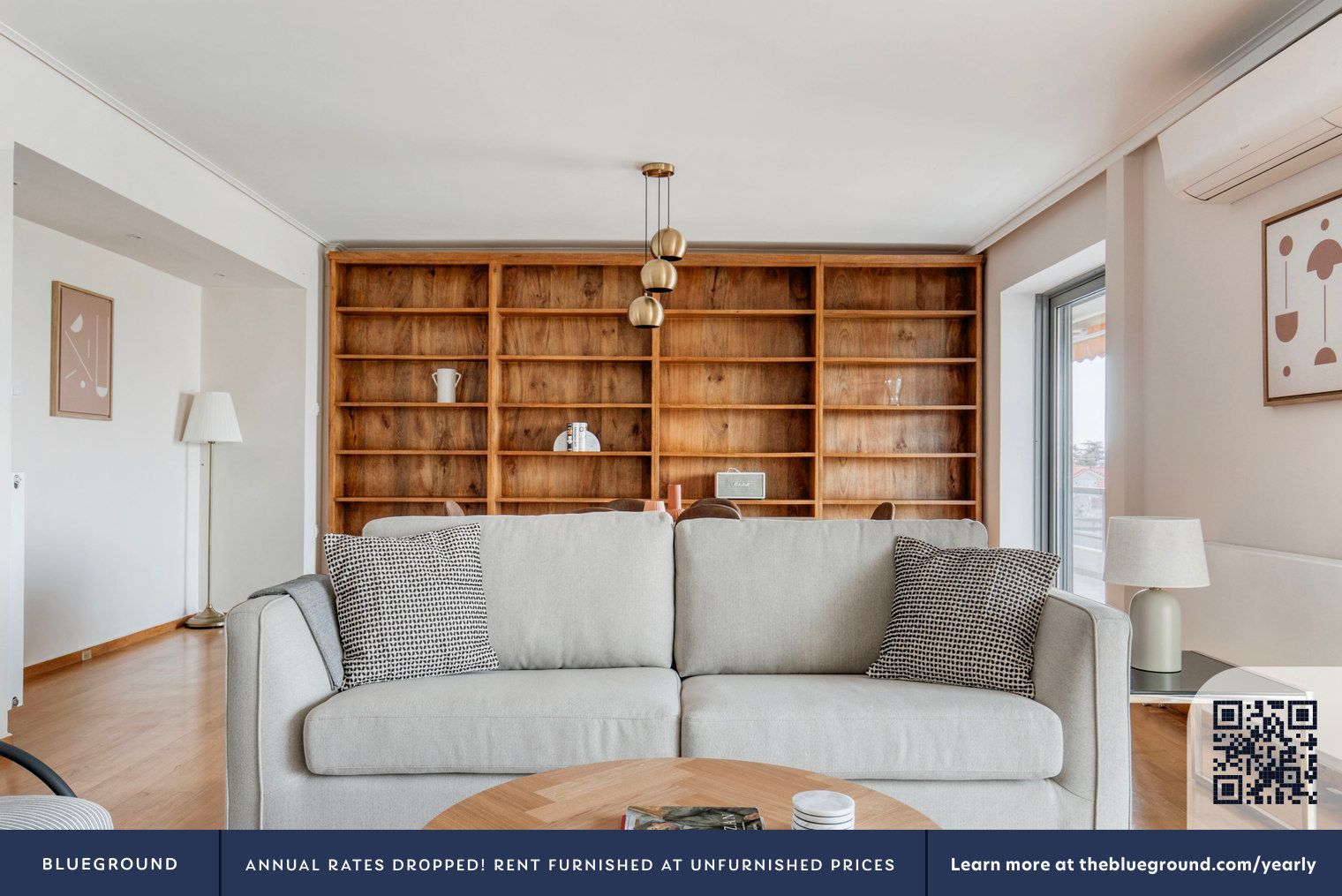 - Watermarks и QR-коды компании Blueground на фото, вероятно, staging для сдачи в аренду