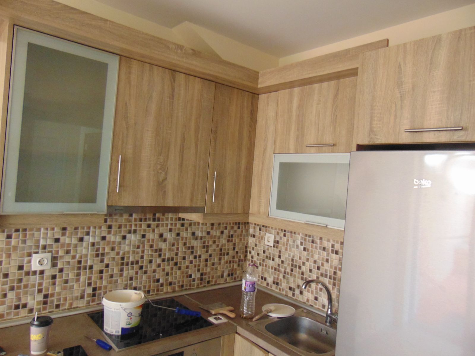 - На столешнице видны строительные материалы и мусор, помещение не подготовлено к съёмке