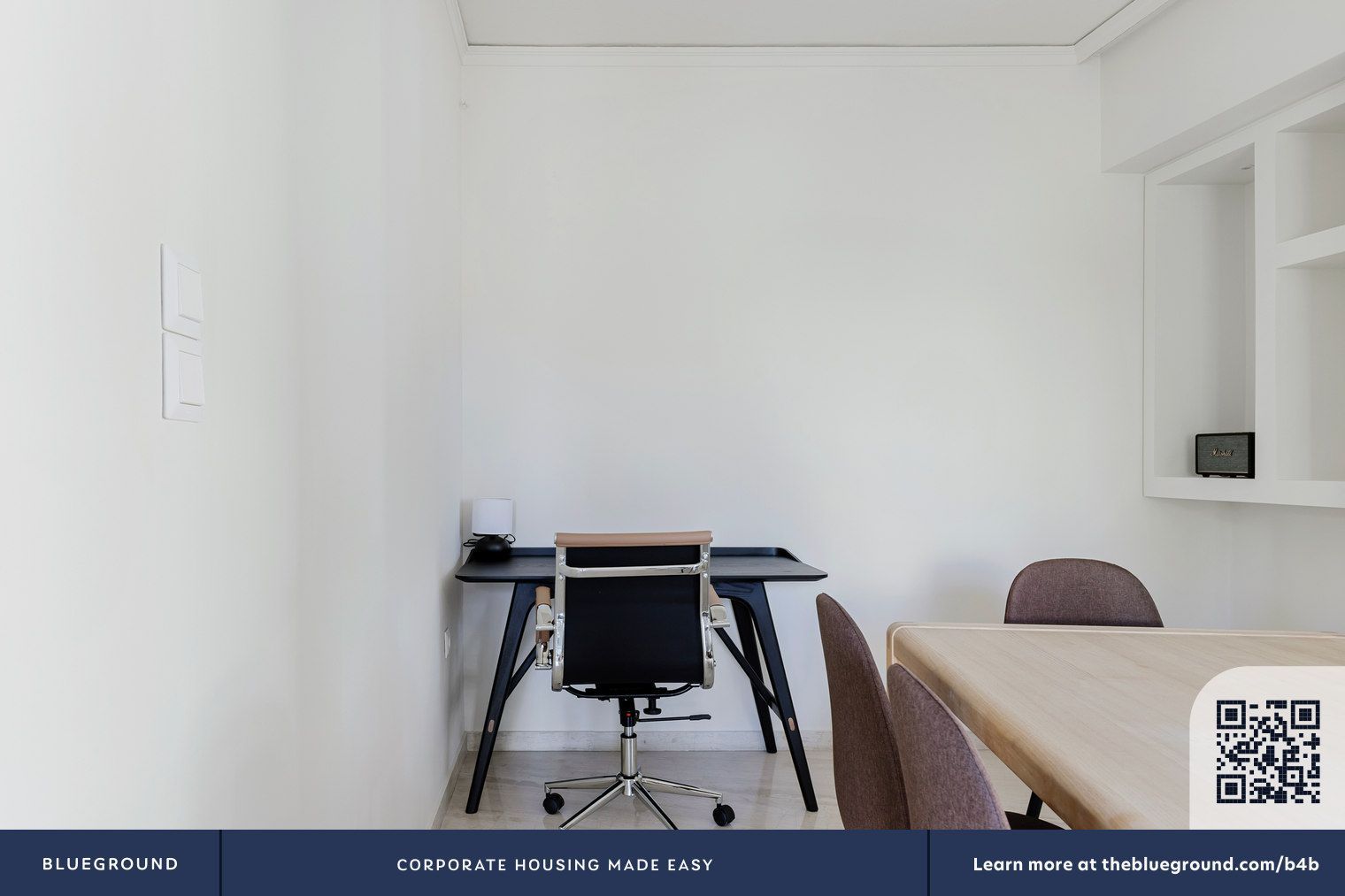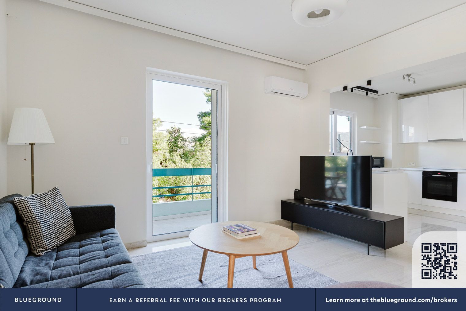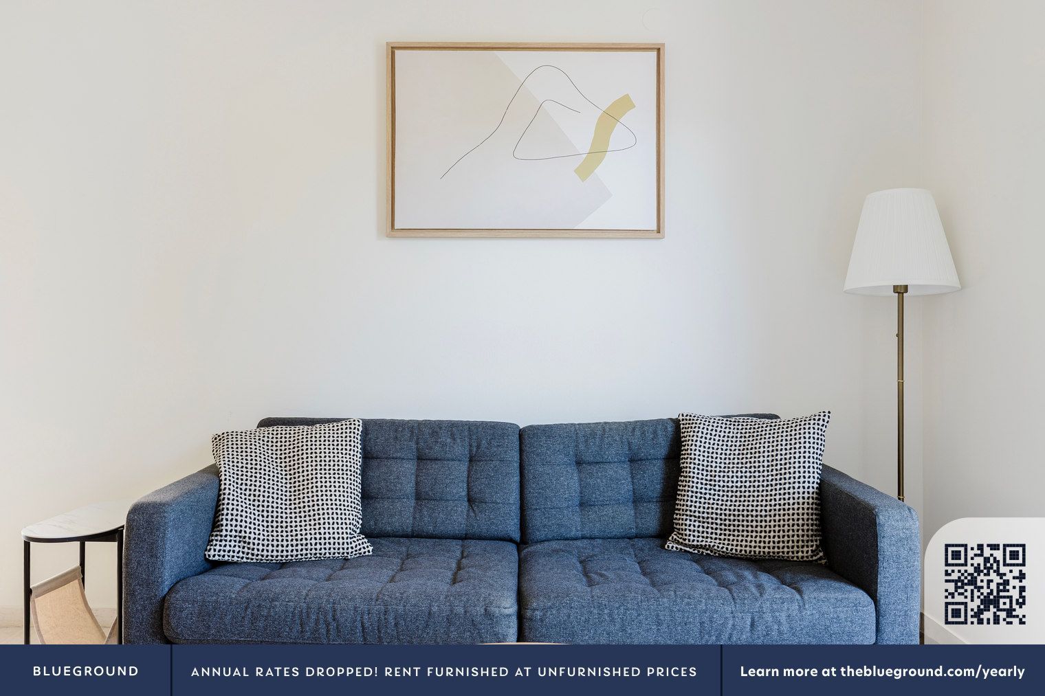 - Профессиональная постановка для аренды, видны рекламные баннеры Blueground