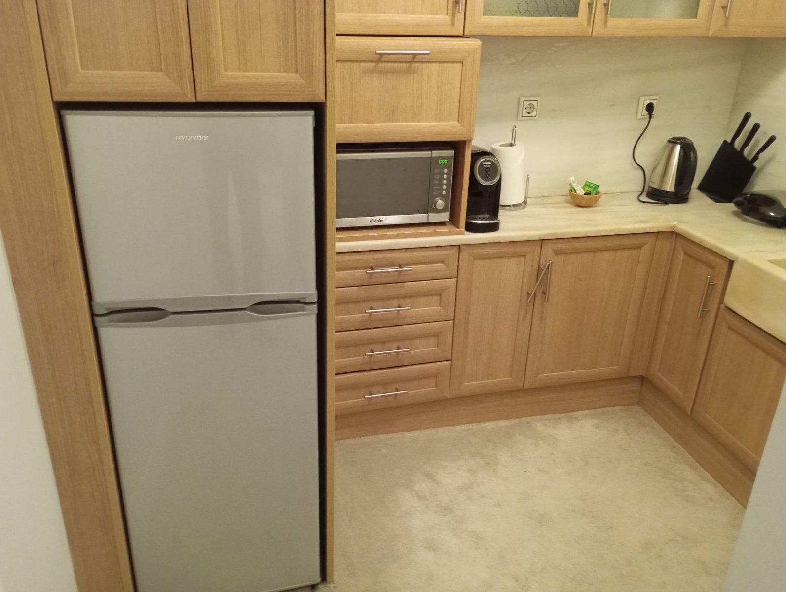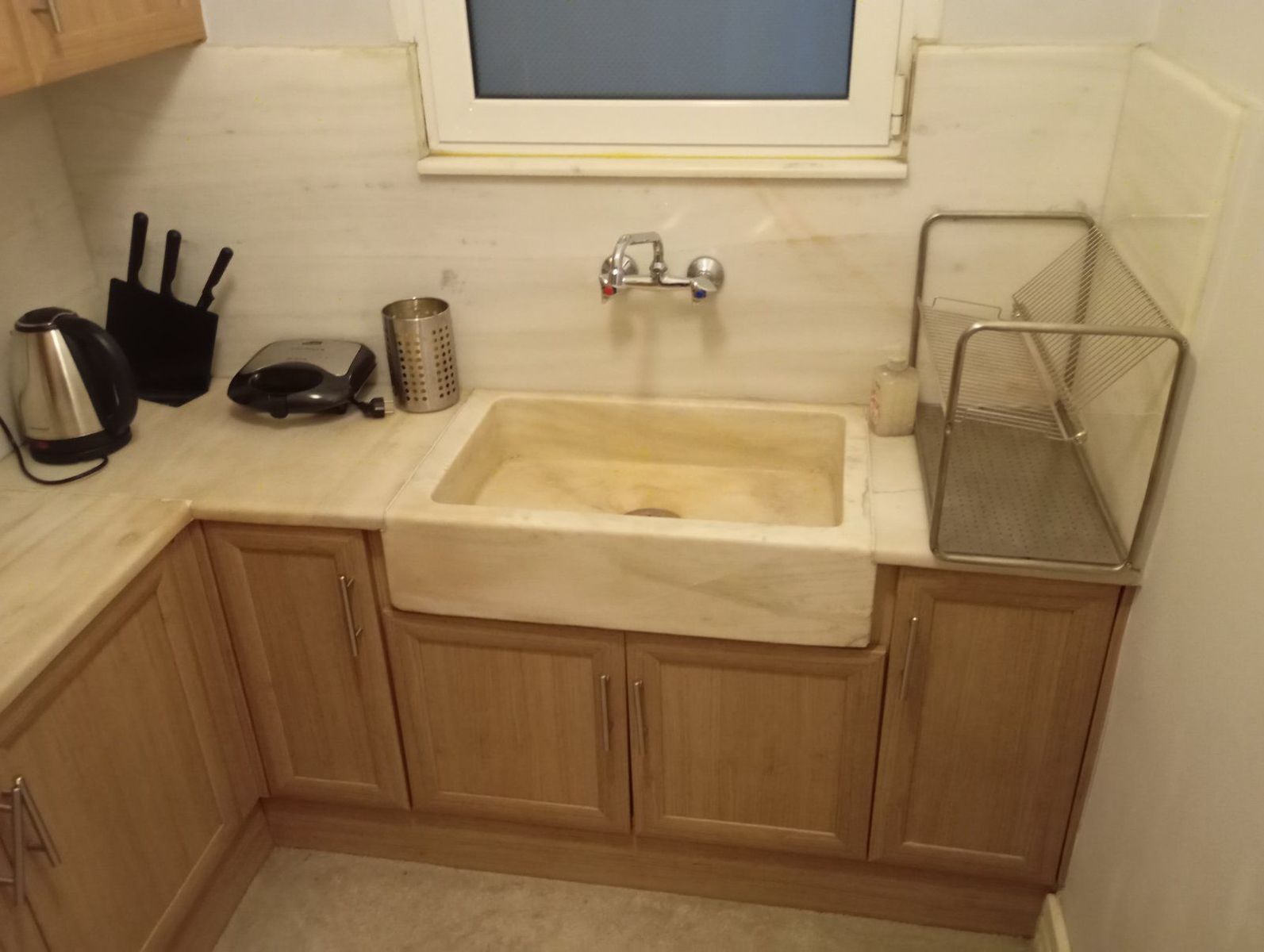 - Простая светлая кухня с базовыми материалами, массивная раковина из искусственного камня