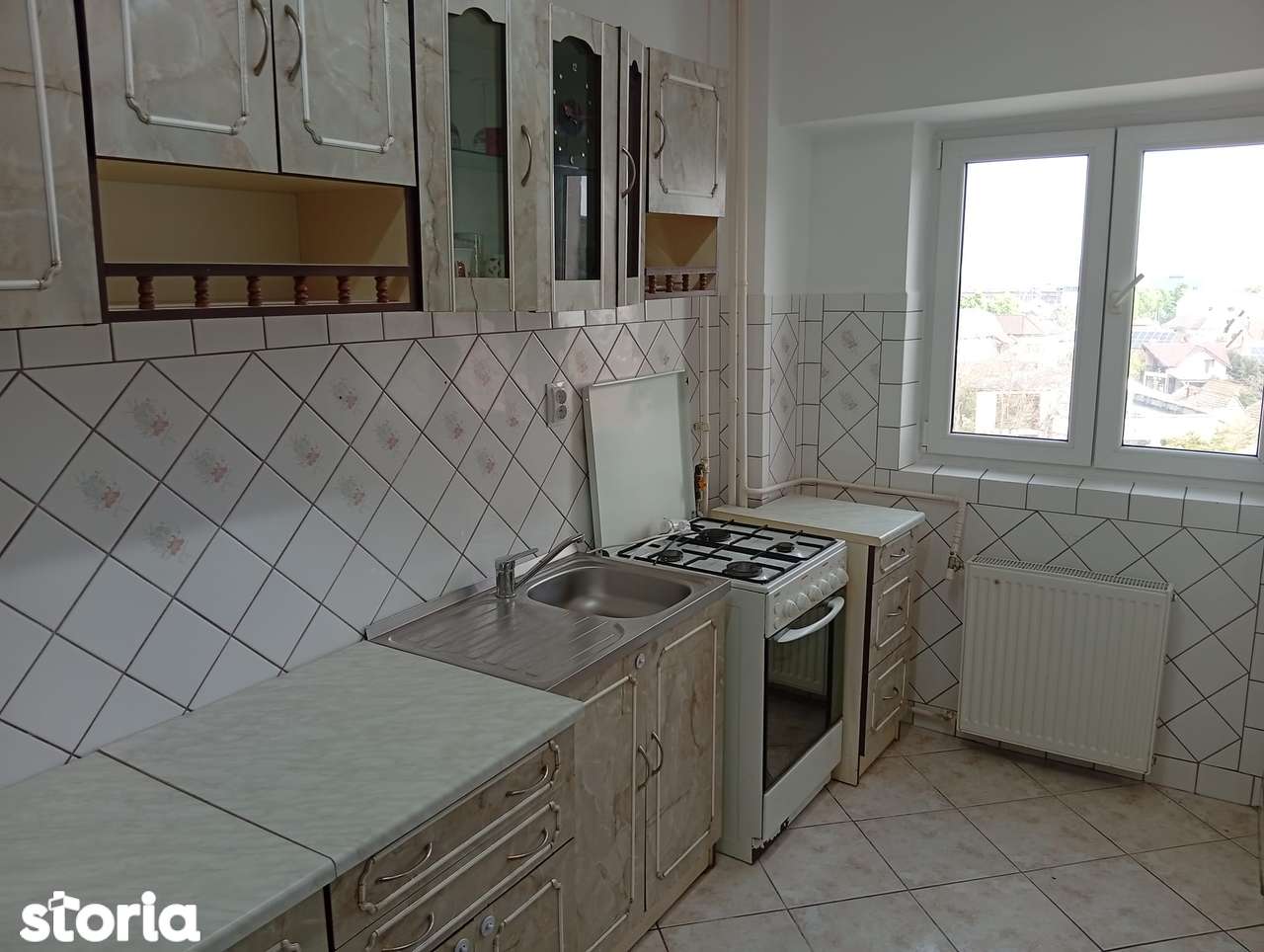 - Старая кухонная мебель с видимым износом, устаревшая плитка с цветочным декором
