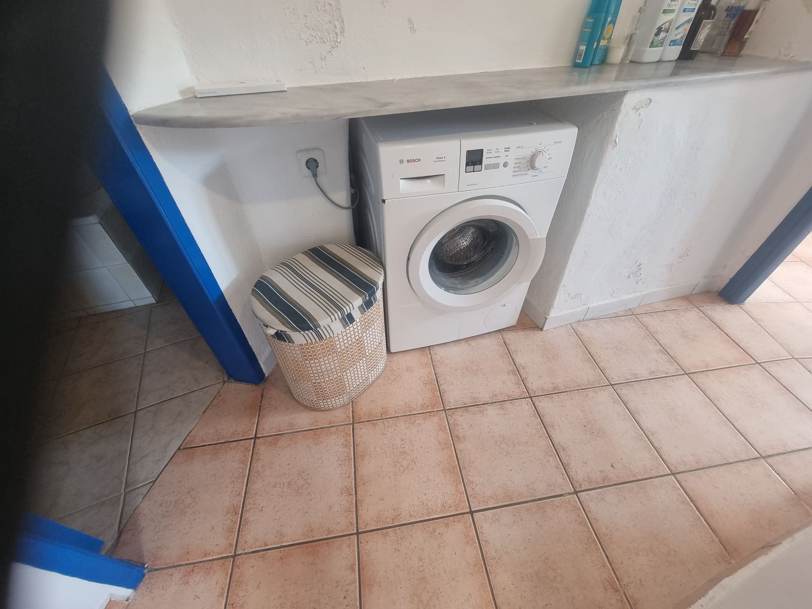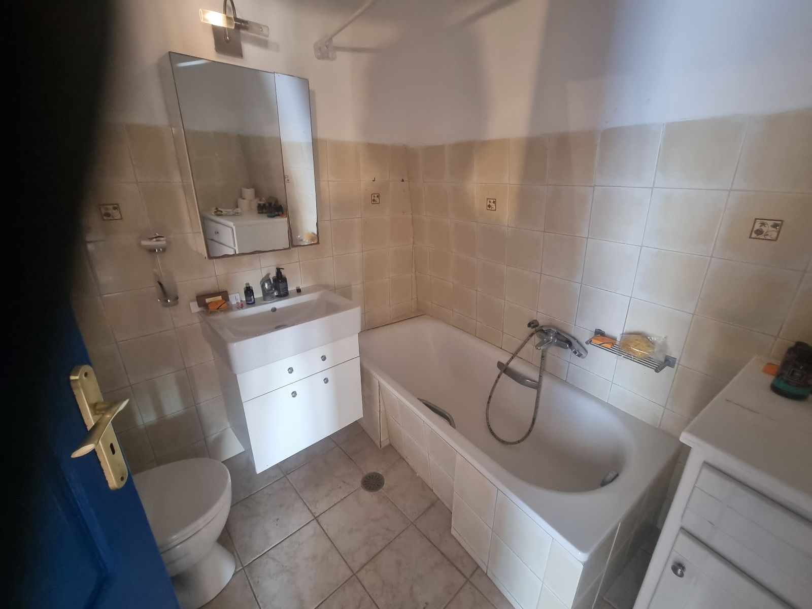 - Видны пятна и потертости на стенах, плитке и полу
