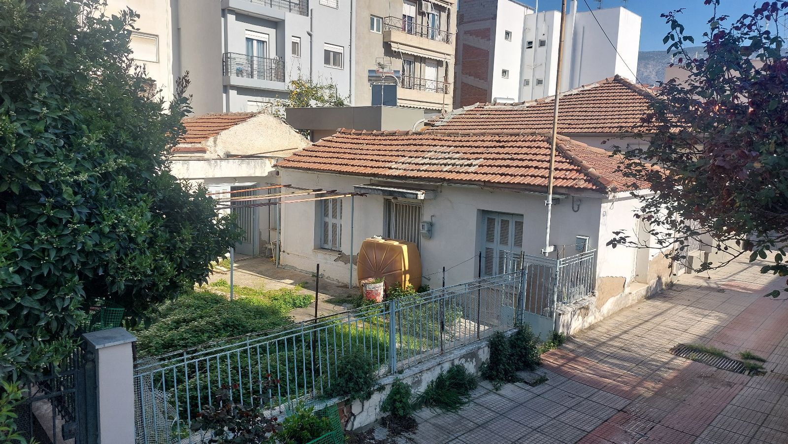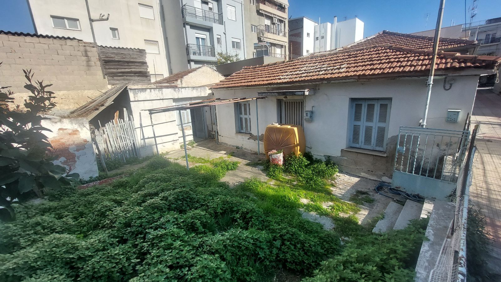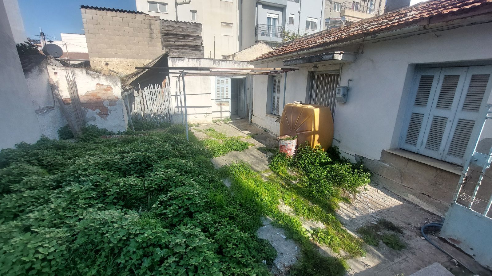- Жёлтая ёмкость (возможно, септик или бак) на участке выглядит неэстетично