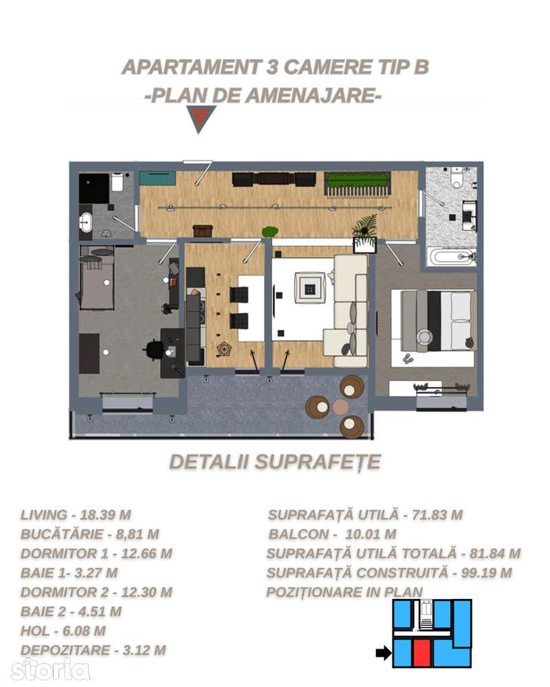 Представляем современный трёхкомнатный апартамент на первом этаже нового жилого комплекса, расположенного на Дунайской набережной в одном из самых популярных районов Галаца. Локация обеспечивает быстрый доступ к променаду, парку Viva и многочисленным зонам отдыха на берегу Дуная. Апартамент спроектирован с учётом комфорта и функциональности: просторная гостиная с доступом на балкон, отдельная кухня, две удобные спальни, две современные ванные комнаты, просторный коридор и отведённые места для хранения. Благодаря расположению на первом этаже в оживлённой зоне, недвижимость может использоваться как жилое пространство, так и коммерческое помещение — офисы, кабинеты или другую коммерческую деятельность. Жилой проект выполнен с вниманием к деталям и включает отделку премиум-качества, обеспечивая высокий стандарт комфорта. Основное оборудование и отделка: - индивидуальный газовый котёл - кондиционер - сантехника премиум-класса - паркет и керамическая плитка высокого качества - современные оконные и дверные конструкции с тепло- и звукоизоляцией - современный лифт и элегантные общие пространства ОДНО НАДЗЕМНОЕ ПАРКОВОЧНОЕ МЕСТО ВКЛЮЧЕНО В СТОИМОСТЬ. Указанная цена НЕ ВКЛЮЧАЕТ НДС.