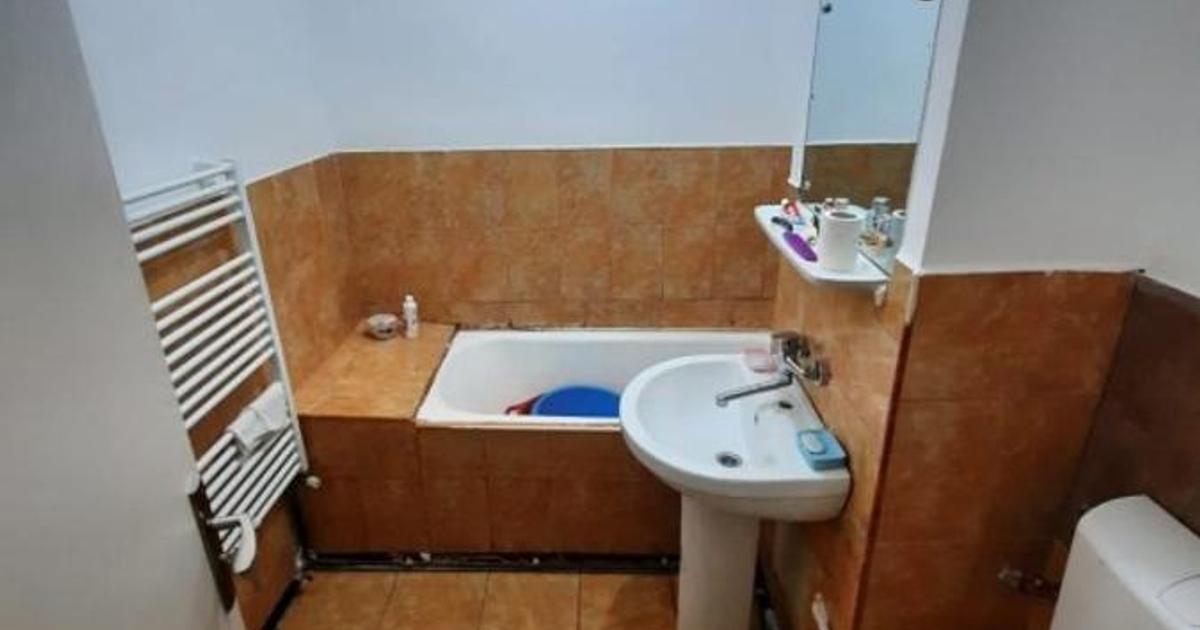 - Ванная с коричневой плиткой устаревшего дизайна, сантехника базовая