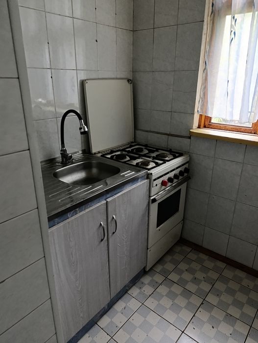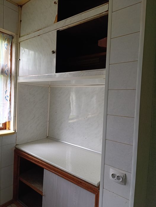 - Кухня в плохом состоянии: облупившаяся краска, старая мебель, видны следы износа