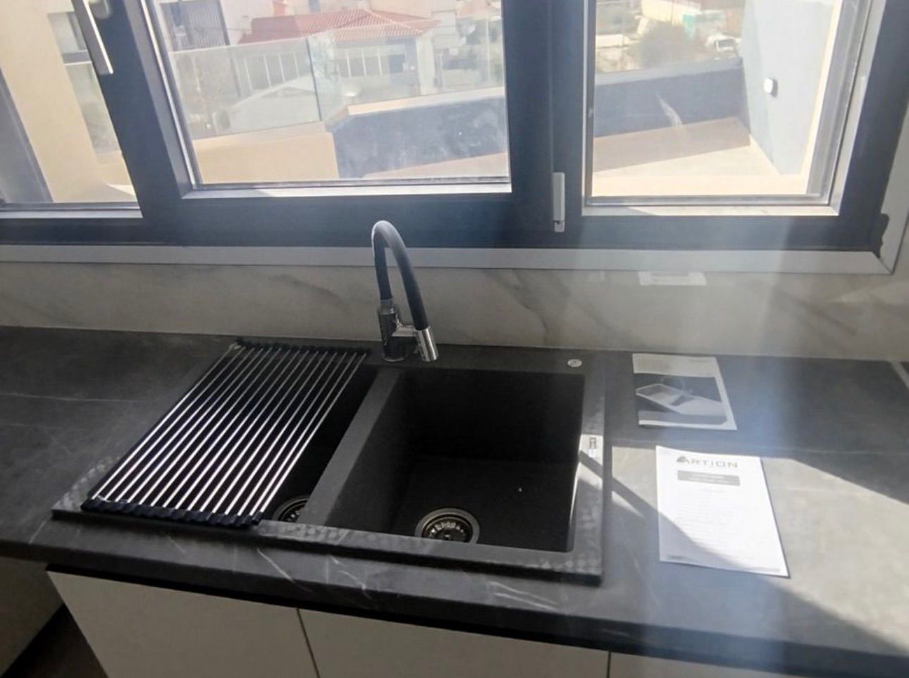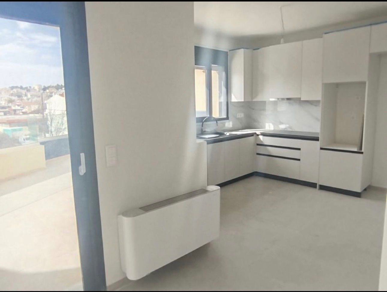 - Отсутствует техника (холодильник, плита), видны инструкции на столешнице — объект не заселён
