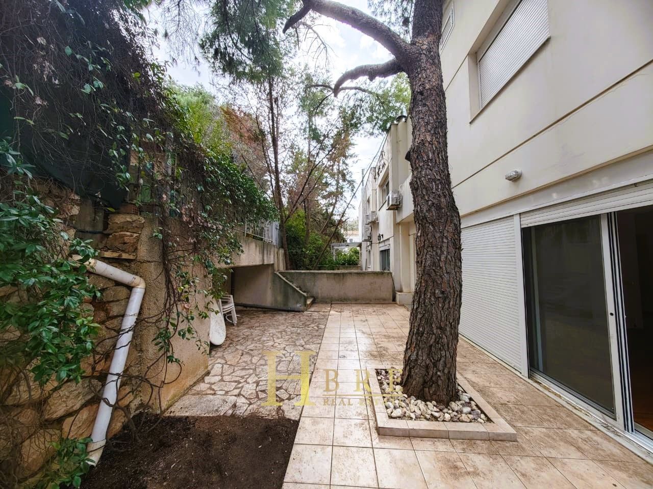 - Видны признаки запущенности: грязная плитка, старый водосток, неухоженный сад