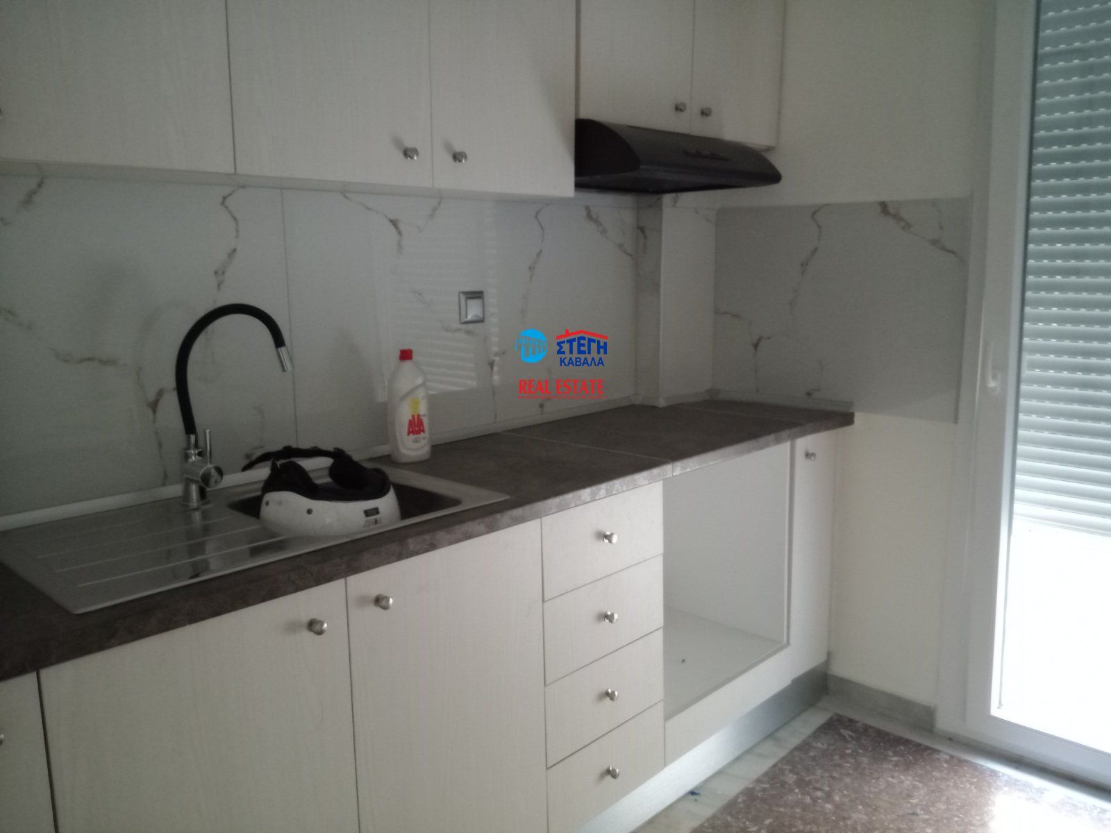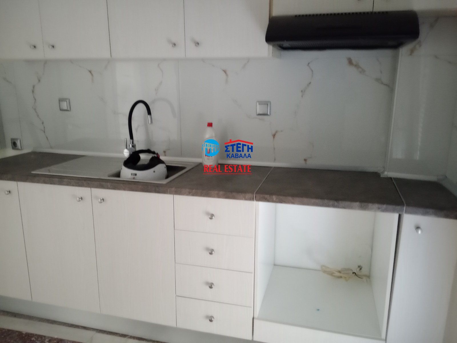 - Кухня без техники и фартук из имитации мрамора выглядит дешево