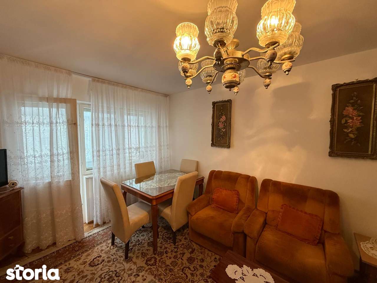 - Советская/устаревшая мебель и отделка, ковер на полу, старая люстра