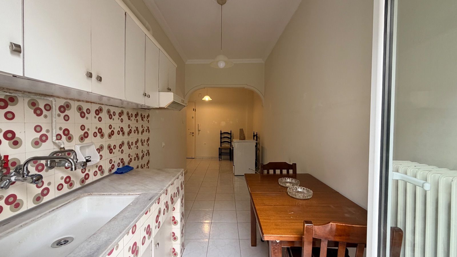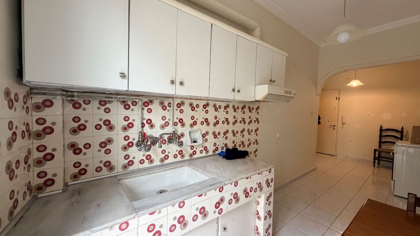 - Устаревшая плитка с ретро-узором, старая кухня, требует замены