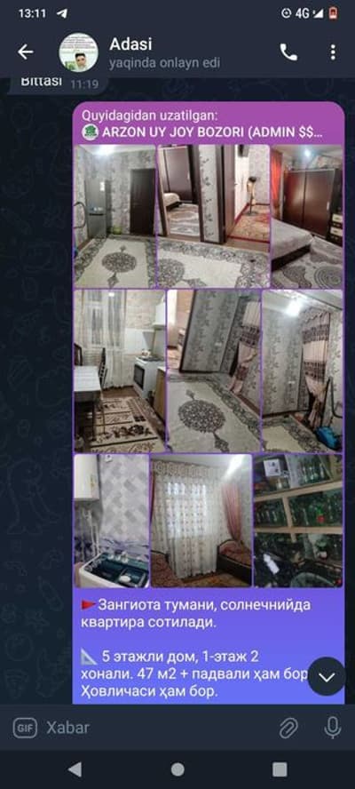 Zangiota tumani Solnishniy markazida joylashgan ,2020 yilda qurilgan.pishgan gʻishtdan qurilgan 4 ejajli dom 1 etajda joylashgan 2 xonali yaxshi remont qilingan , kanditsaner vay fay shaxsiy kuzatuv kamerasi bor ,mebellari,kanditsaner kelishilgan xolda qoladi, yaqinida maktab Bogcha paliknika yaqin magazinlarni soni cheksiz, Abu saxiy ipadrom bozoriga 4 km yaqin, transport zor ,podvol qurilgan uyni tegida agarodi bor daraxtlari xosilga kirdi ogan odam mazza qib yashidi. Tel 97. 764-55-58 93. 538-97-68