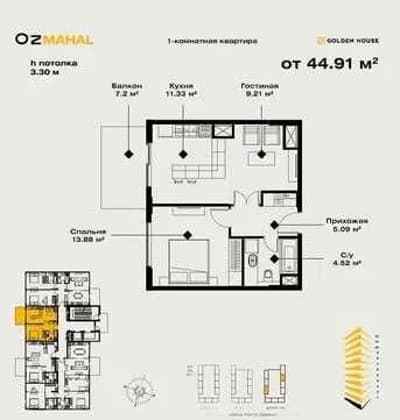 ЖК Oz Mahal 2 комнатная коробка (Студия) 46м2 Golden House