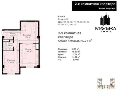 ЖК Mavera Town 2 комнатная 60м2 8 роддом ориентир Яккасарай