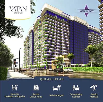 Xon saroy Vatan residence 3 xonali 68.4 m2 Terassa 30.8 kv metr 5-etajda joylashgan. 60 000 ming naxt qolgani 25 ming rasrochka (16 oyga) Xon Saroyga to'lanadi 2026 yil 4-chorakda qurilish yakunlanadi, kadastr 2027 yil 1-chorakda chiqariladi. Kvartira nomingizga notariusda orqali qayta rasmiylashtiriladi. Mo'ljal Bo'z bozor, metro Buyuk ipak yo'li Mirzo Ulugʻbek tumanida joylashgan. Manzil Ravnaq kochasi 1-uy. Xozirgi kunda 80 foiz tugallangan. Uy ozimniki bez makler Tel 97 171 45 75